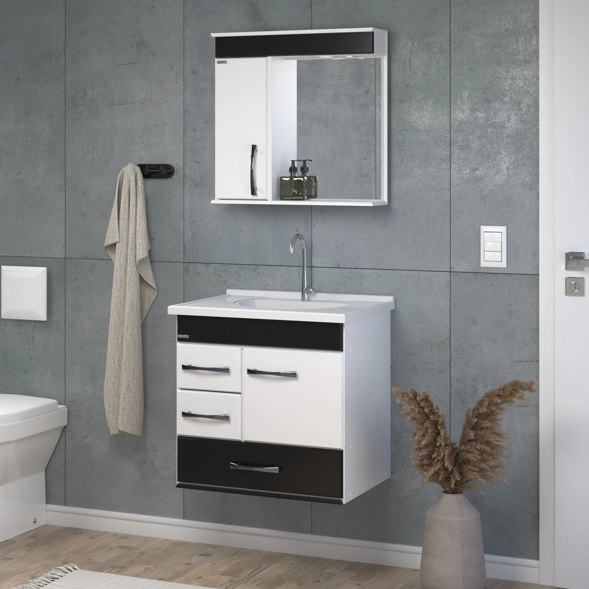 Kit suspenso em MDF/MDP com 59,5cm de largura, linha Mônaco, inclui gabinete, espelho, cuba. Acabamento refinado com espelho de borda chanfrada. Disponível em 2 opções de cor.
