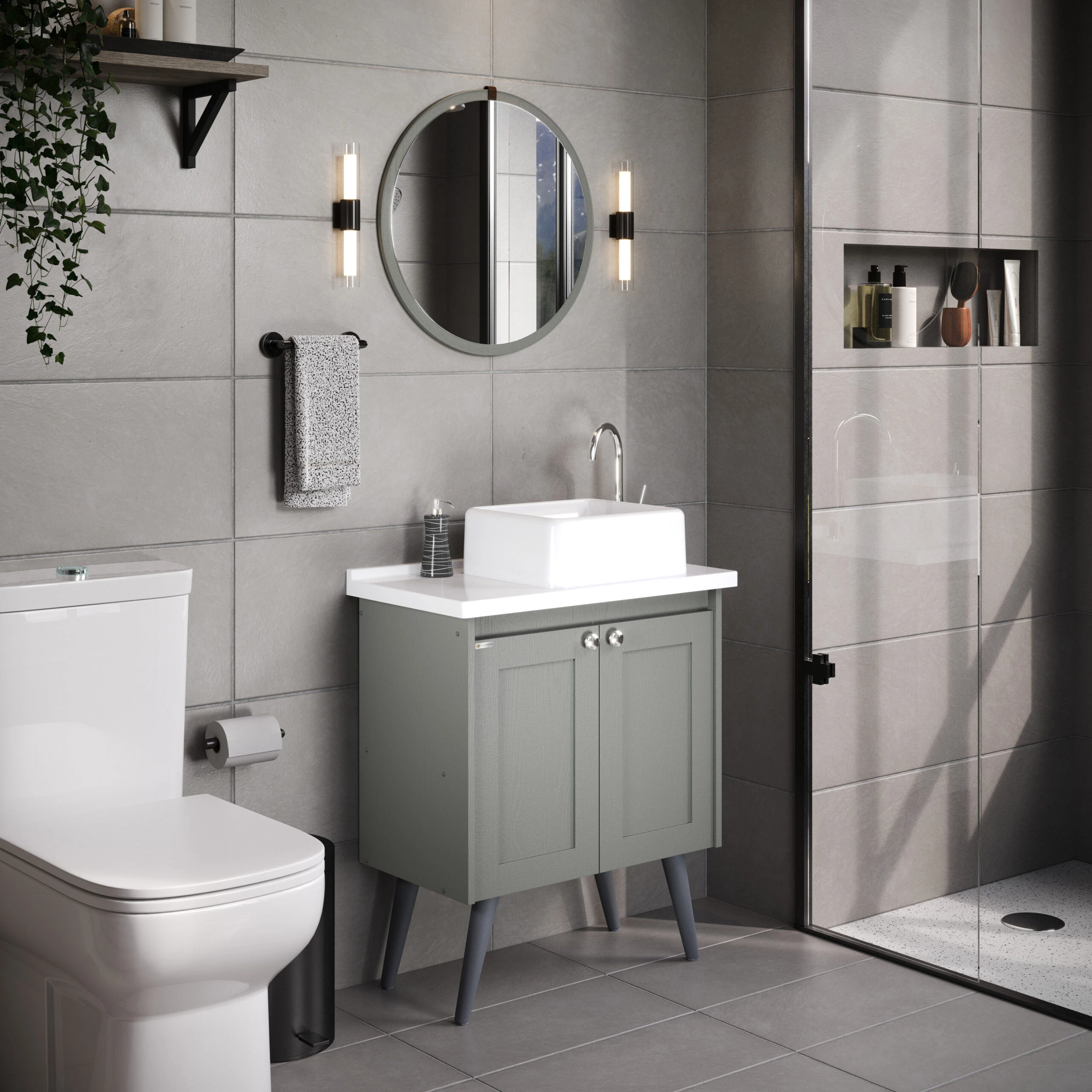 Kit com pé em MDF/MDP, linha Paris, inclui gabinete, espelho, cuba. Modelo clássico com boa capacidade de armazenamento. Disponível em 4 opções de cor.