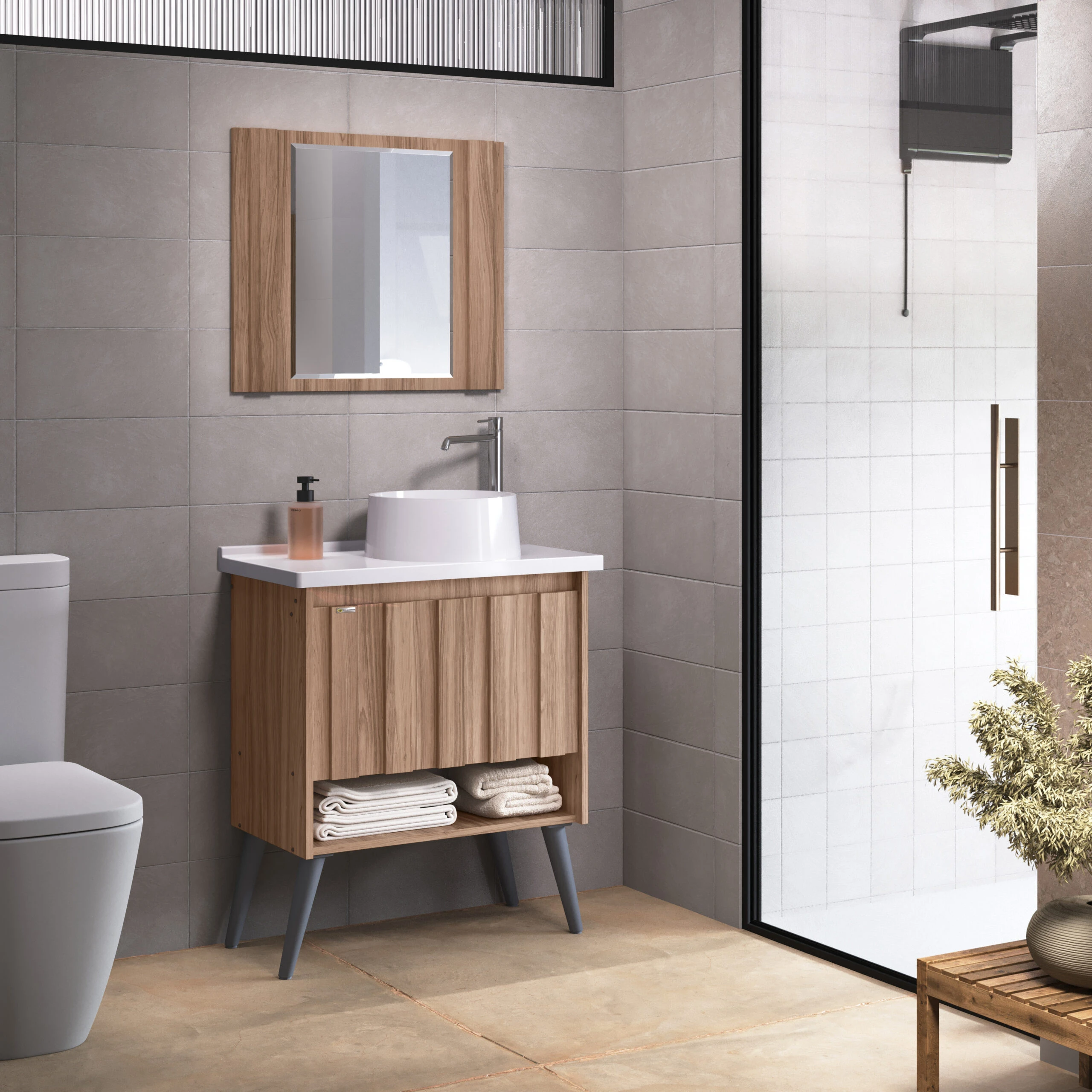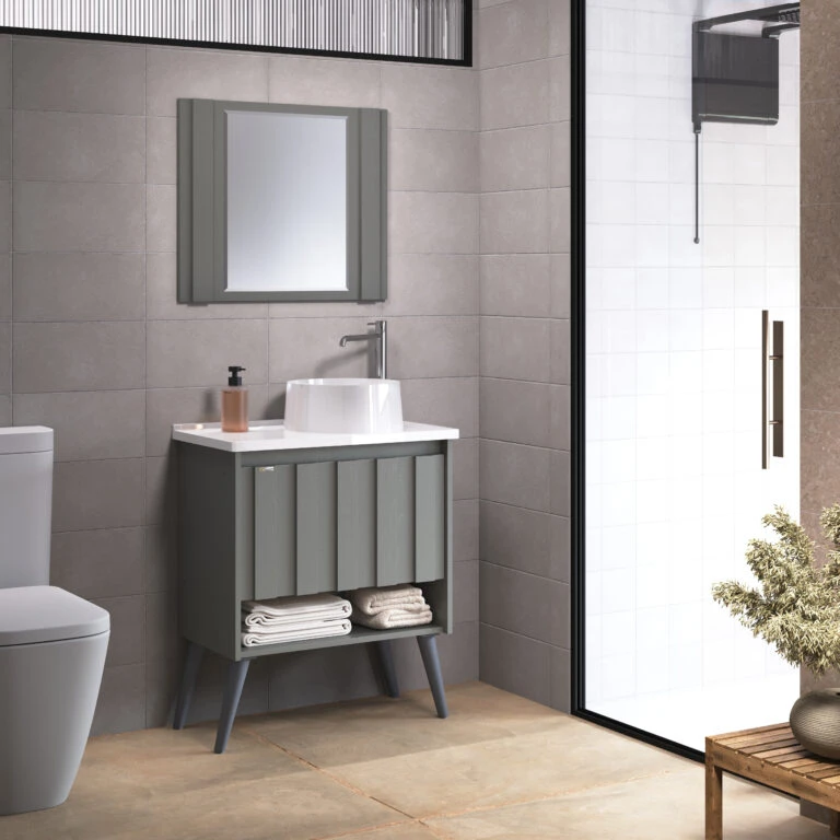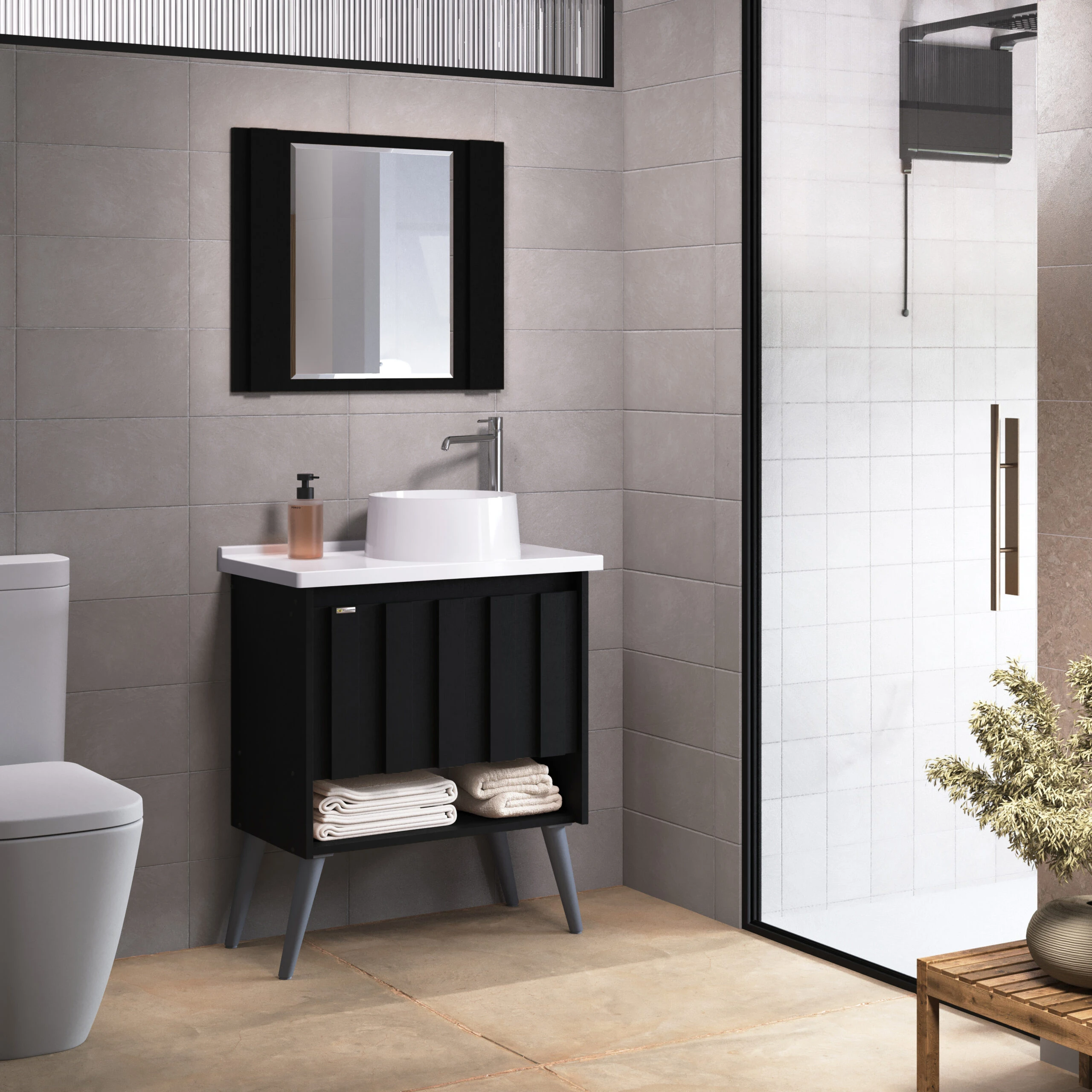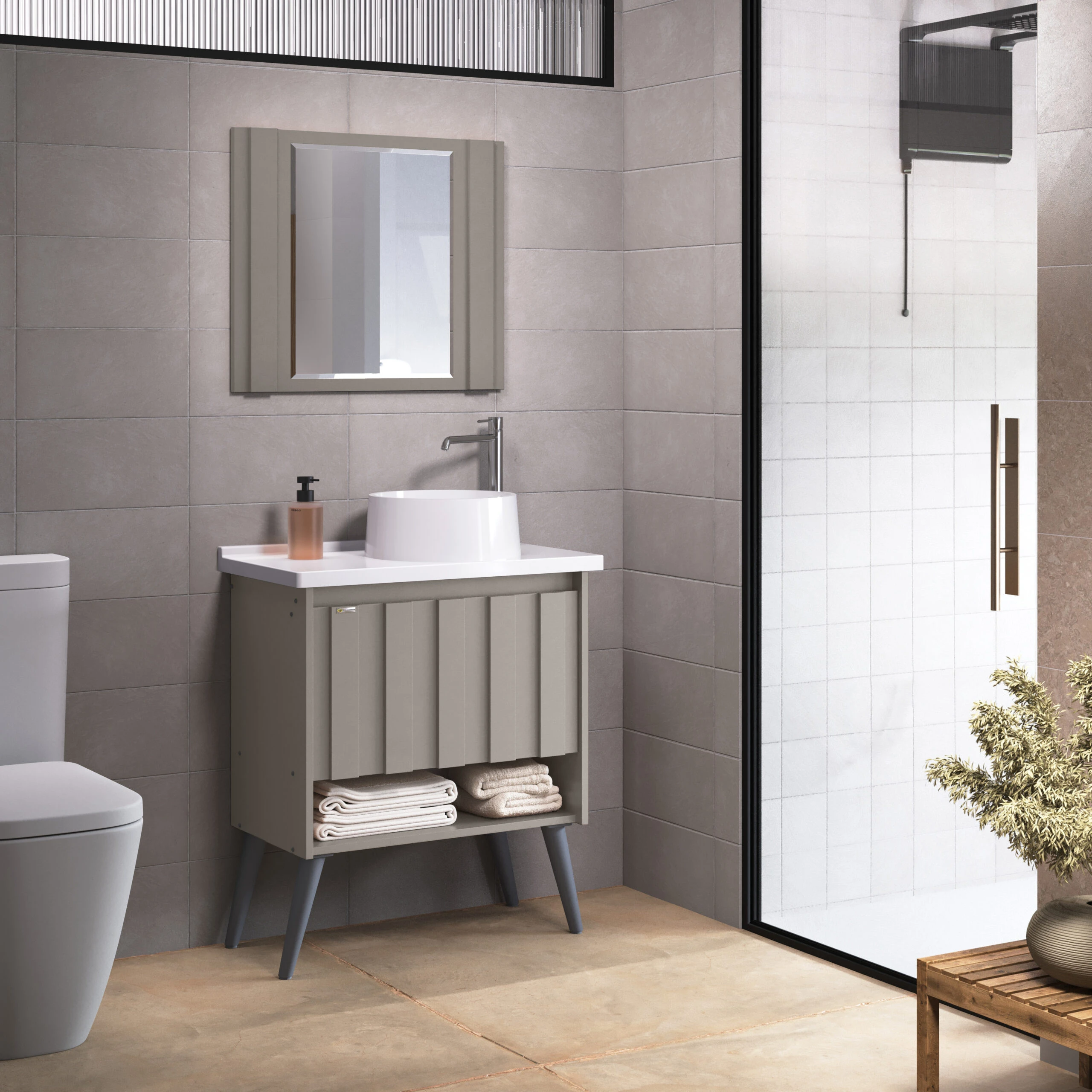 Kit com pé em MDF/MDP, linha Treviso, inclui gabinete, espelho, cuba. Linha com portas e prateleiras internas para organização. Disponível em 4 opções de cor.