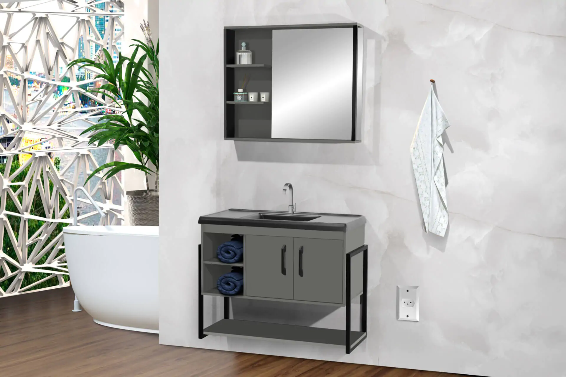Kit com 80cm de largura em MDP/MDF, inclui espelheira, gabinete. Versão com pés metálicos para visual industrial. Disponível em 3 opções de cor.