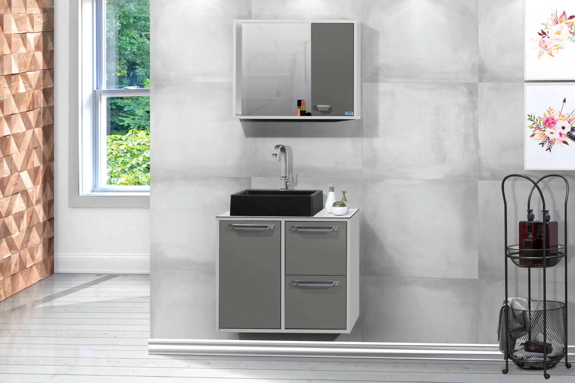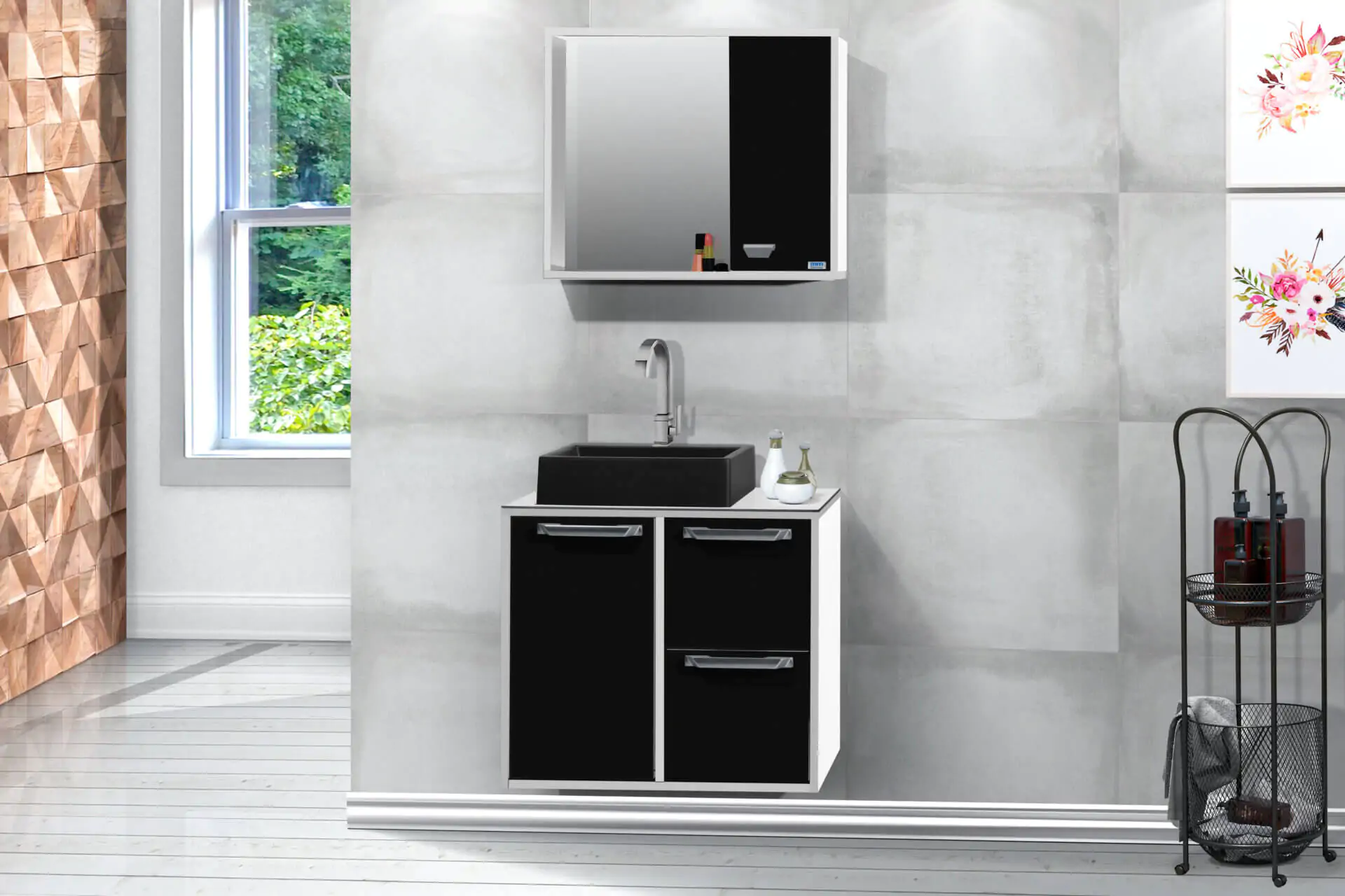 Kit com 60cm de largura em MDP/MDF, inclui cuba, espelheira, gabinete. Tampo de vidro opcional, gavetas com corrediças telescópicas. Disponível em 6 opções de cor.