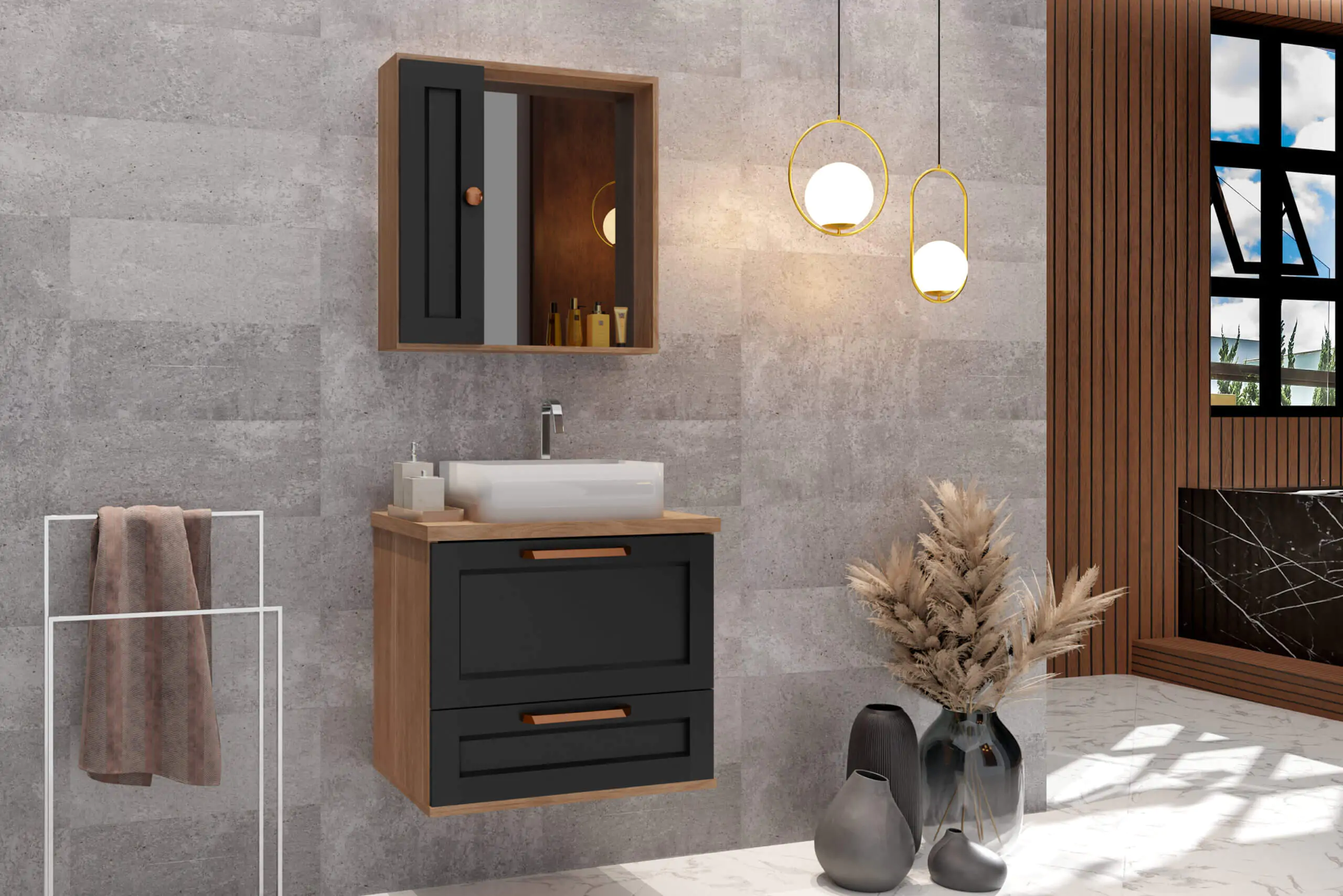 Kit com 60cm de largura em MDP/MDF, inclui espelheira, gabinete. Conjunto completo pronto para instalação. Disponível em 2 opções de cor.