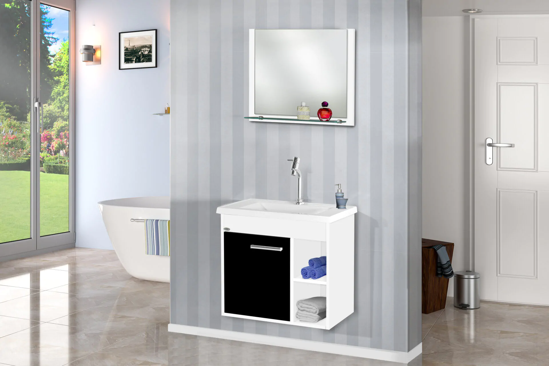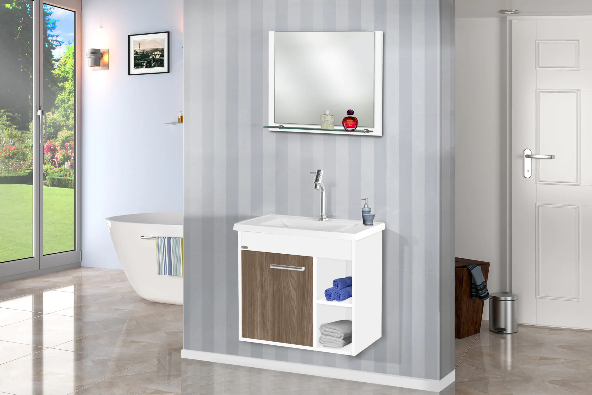 Kit com 60cm de largura em MDP/MDF, inclui espelheira, gabinete. Conjunto completo pronto para instalação. Disponível em 4 opções de cor.