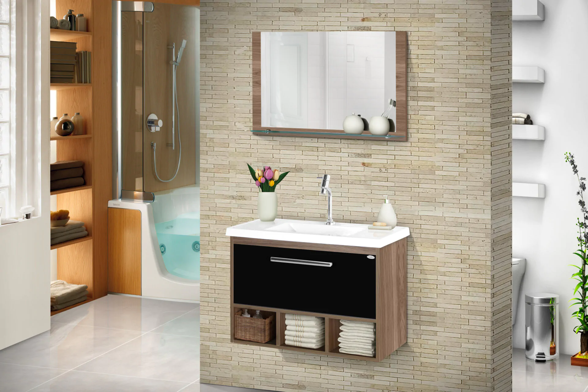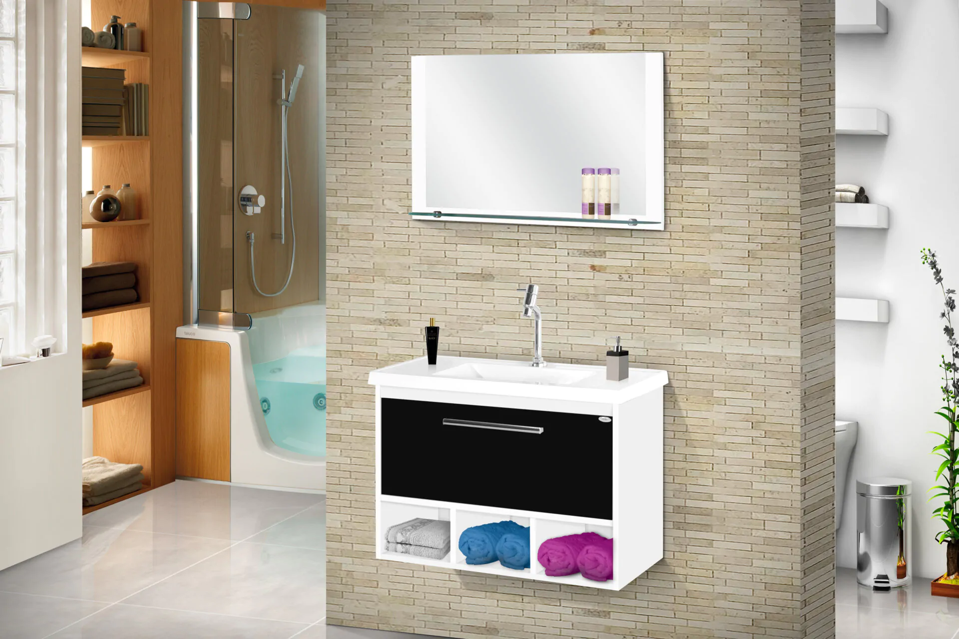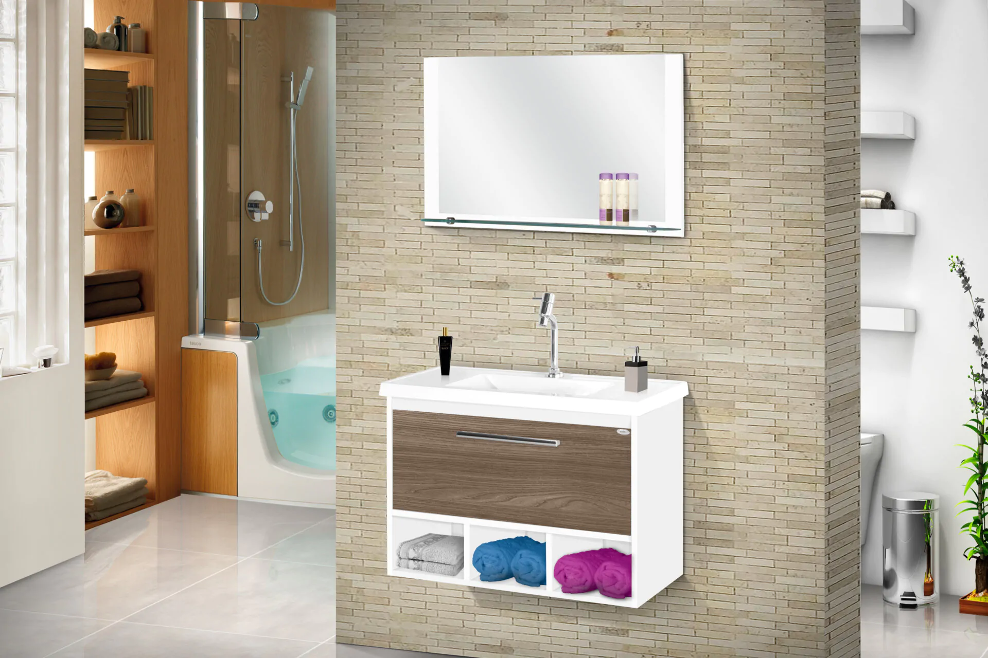 Kit com 70cm de largura em MDP/MDF, inclui espelheira, gabinete. Conjunto completo pronto para instalação. Disponível em 4 opções de cor.