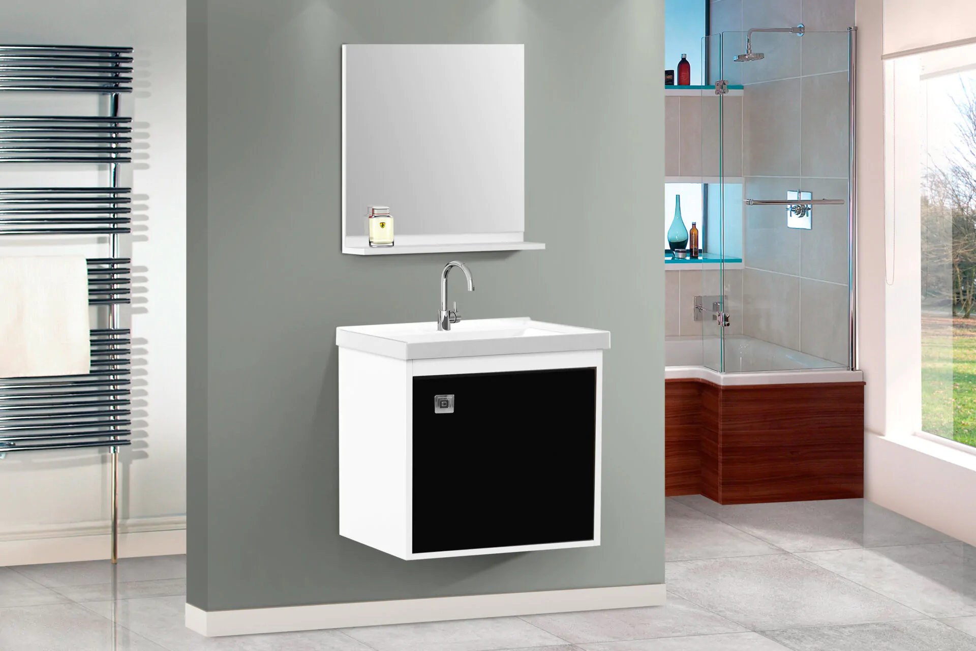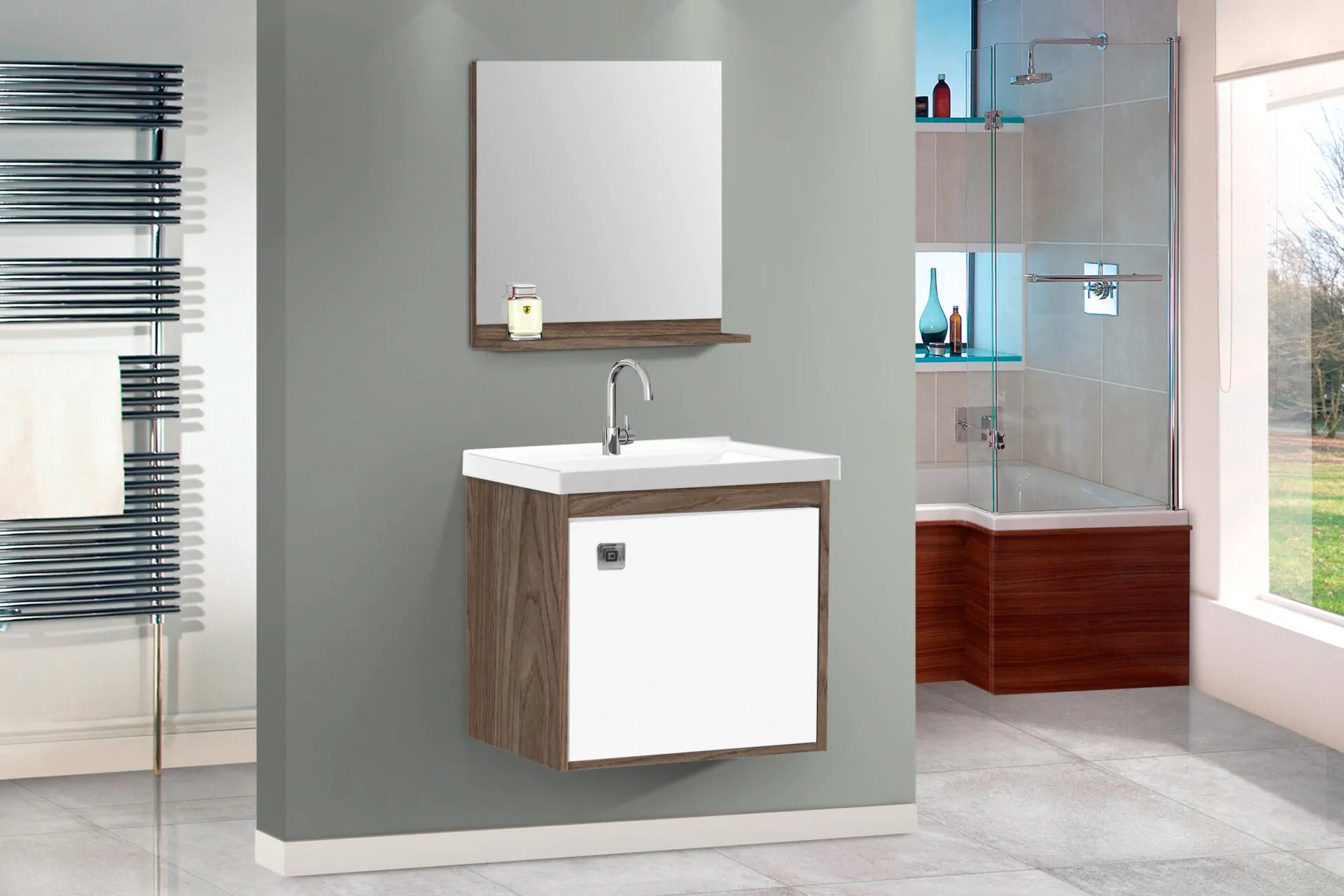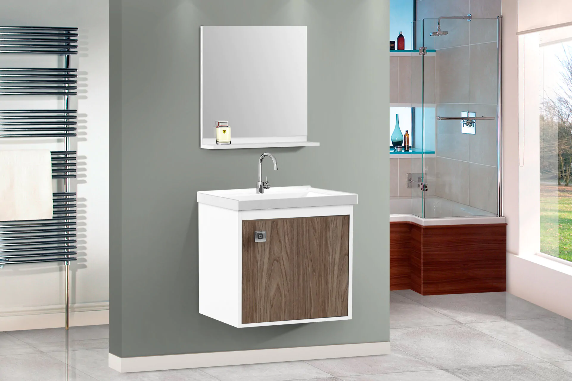 Kit com 40cm de largura em MDP/MDF, inclui cuba, espelheira, gabinete. Modelo compacto para banheiros e lavabos menores. Disponível em 5 opções de cor.