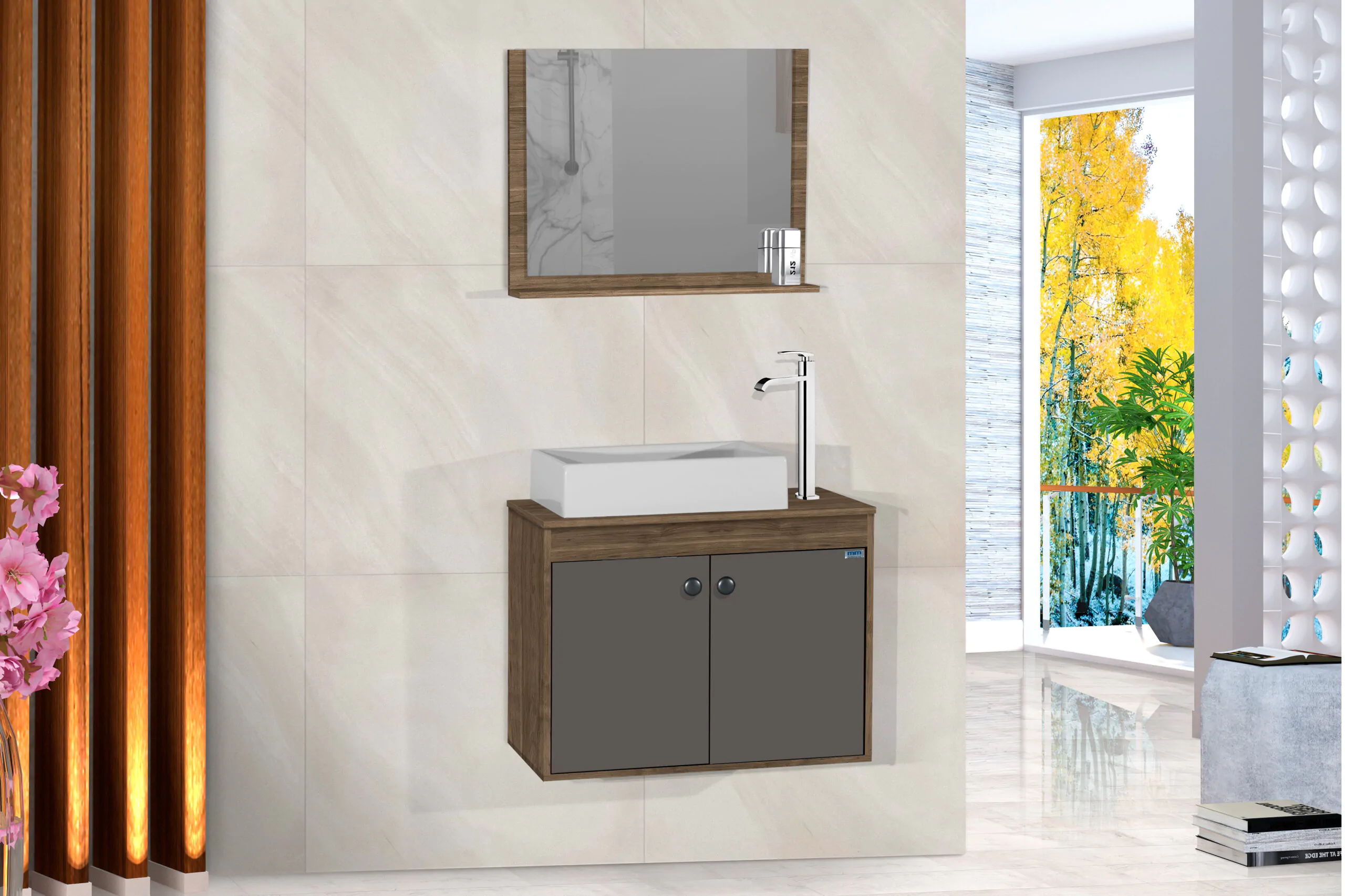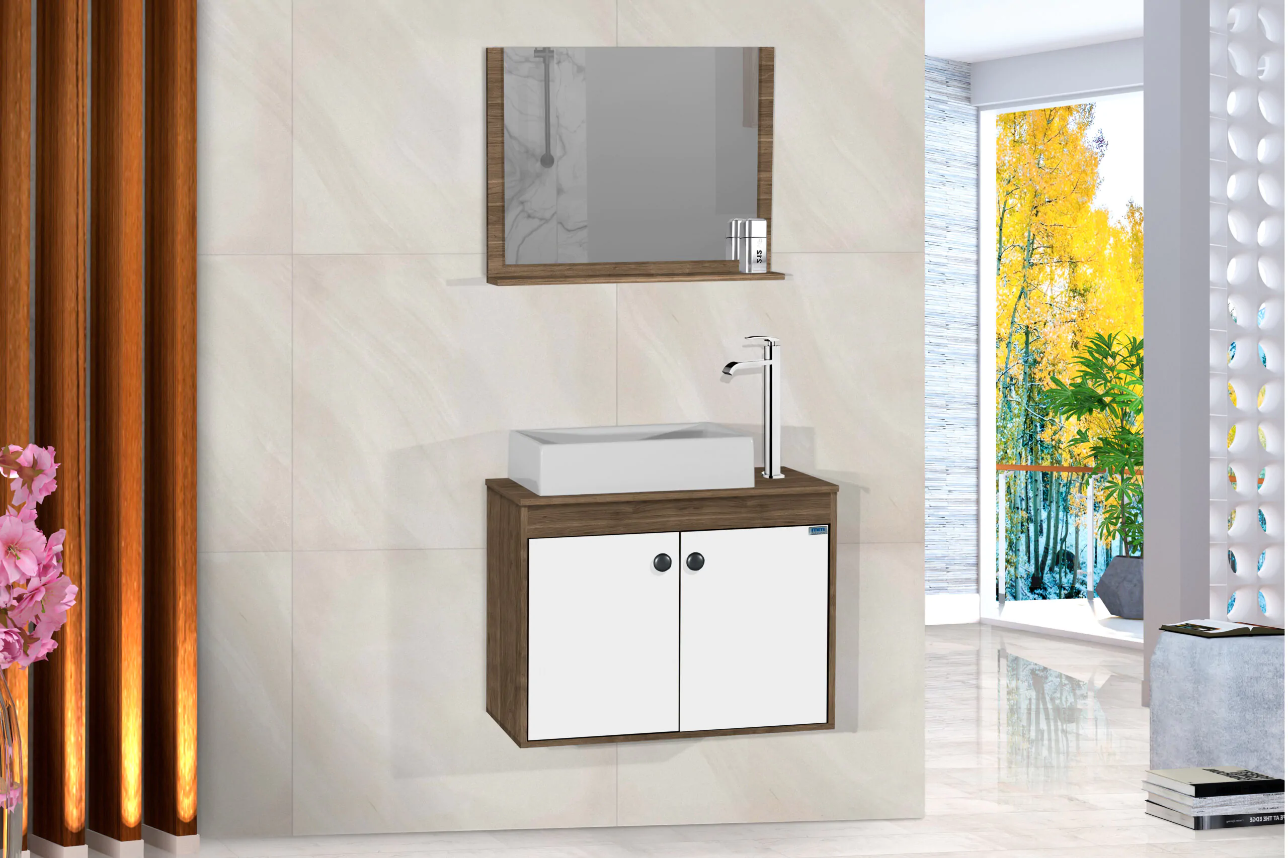 Kit com 60cm de largura em MDP/MDF, inclui cuba, espelheira, gabinete. Conjunto completo pronto para instalação. Disponível em 2 opções de cor.