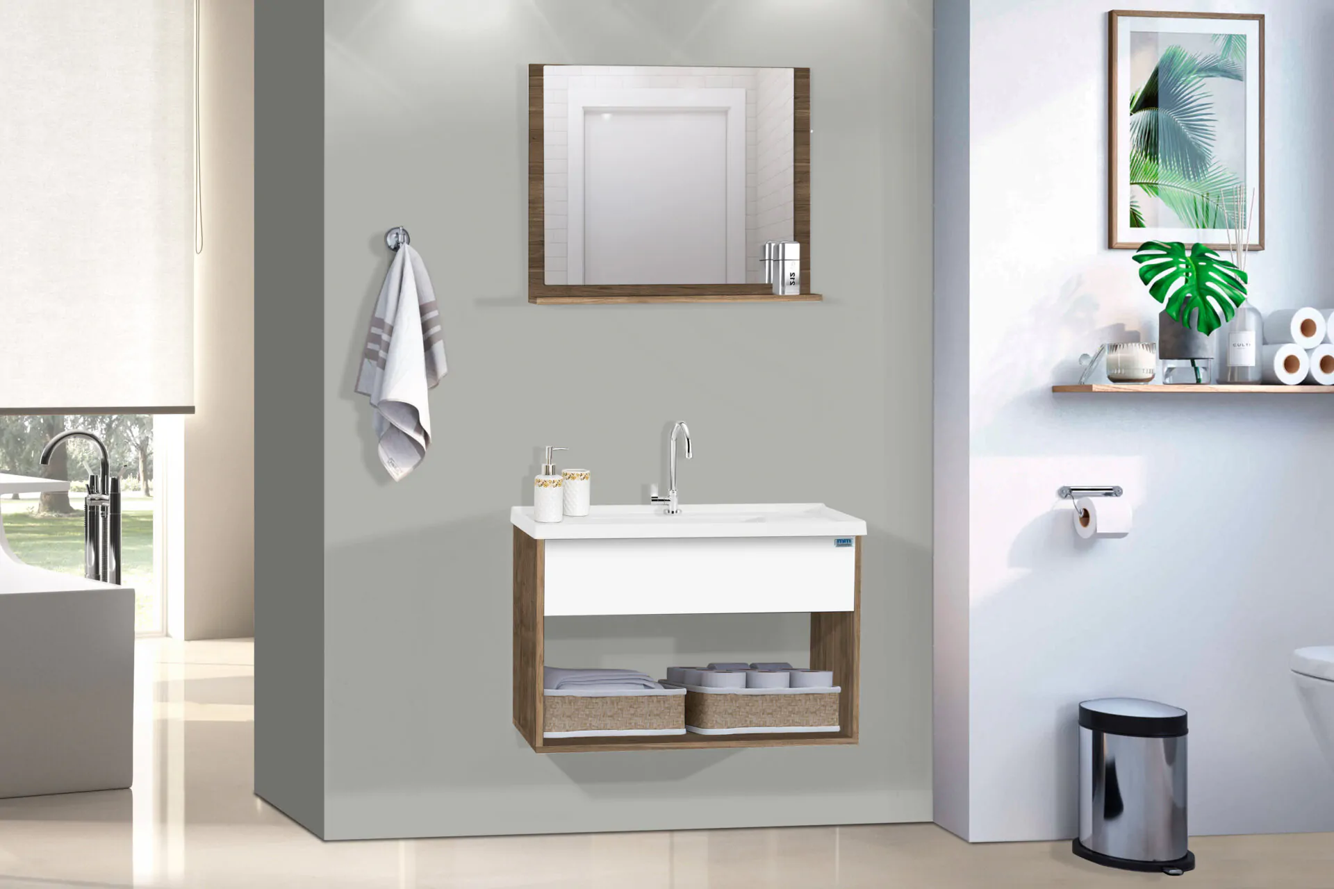 Kit com 60cm de largura em MDP/MDF, inclui espelheira, gabinete. Conjunto completo pronto para instalação. Disponível em 2 opções de cor.