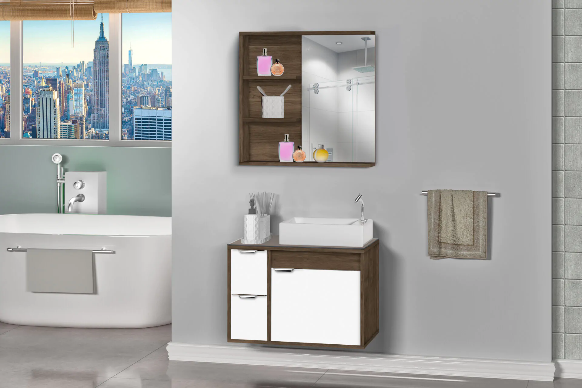 Kit com 60cm de largura em MDP/MDF, inclui cuba, espelheira, gabinete. Tampo de vidro opcional, gavetas com corrediças telescópicas. Disponível em 2 opções de cor.