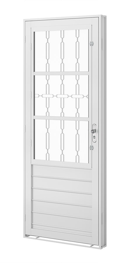 Porta com postigo em aço, linha Aço Arte. Permite ventilação e visibilidade mesmo com a porta fechada. Disponível nos tamanhos: 85x215cm.
