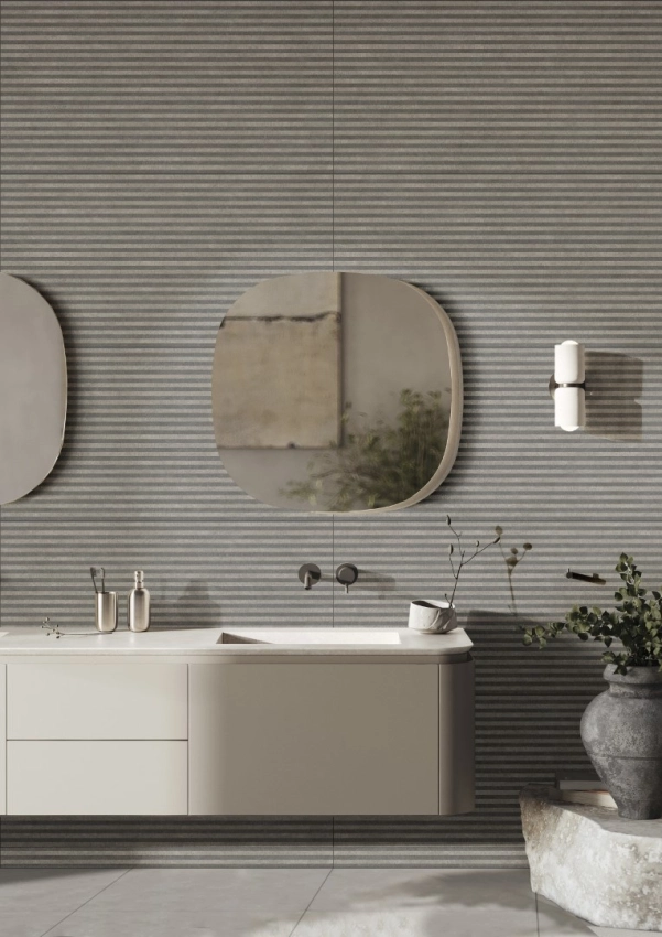 Revestimento ripado tom rosé. Visual sofisticado para paredes internas.
