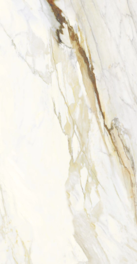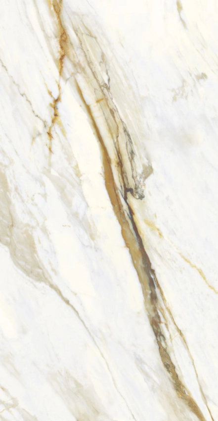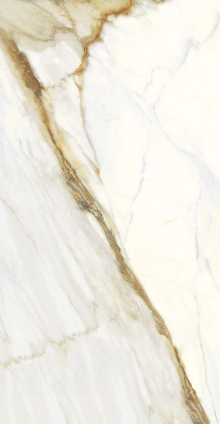 Mármore branco com veios dourados. Formato grande para ambientes imponentes.