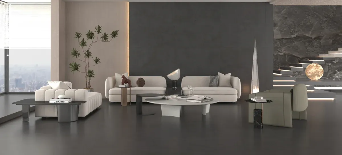Porcelanato Monier Carbon Acetinado 120x120. Visual urbano e contemporâneo com efeito cimentício.