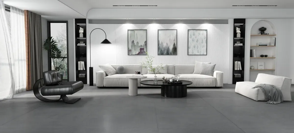 Porcelanato Monier Grigio Acetinado 90x90. Visual urbano e contemporâneo com efeito cimentício.