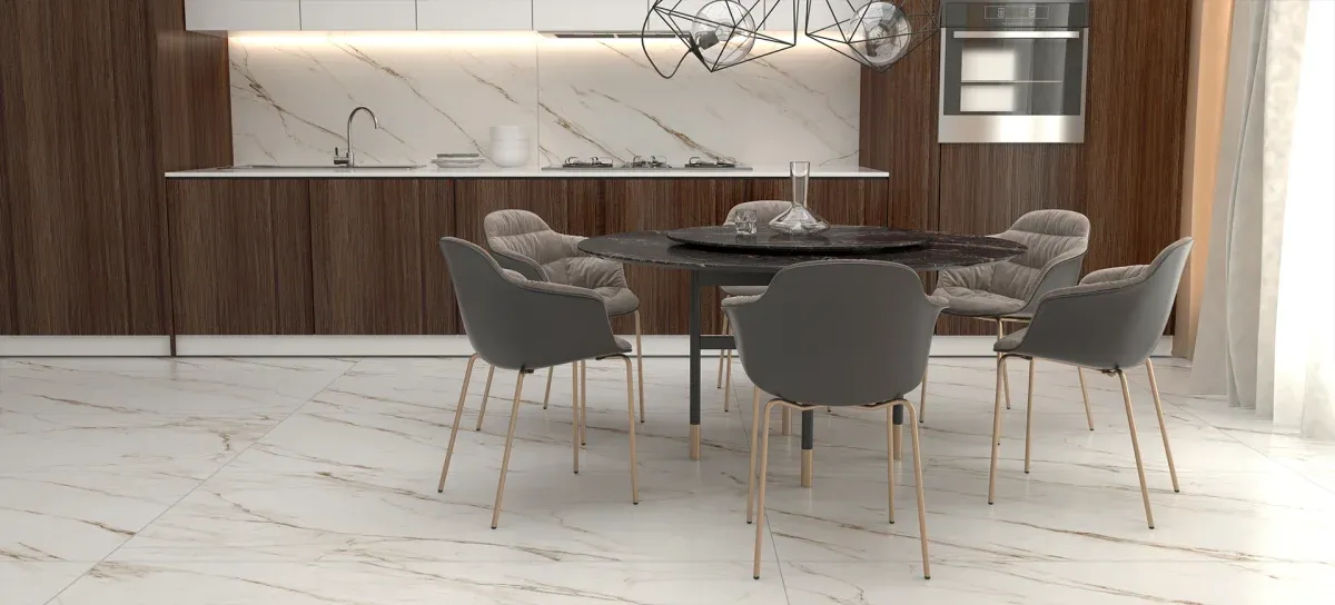 Porcelanato Raggi Oro Acetinado 90x180. Inspiração em mármore com veios elegantes.