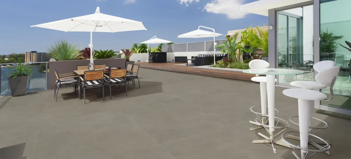 Porcelanato Piazza Taupe Natural 120x120. Visual urbano e contemporâneo com efeito cimentício.