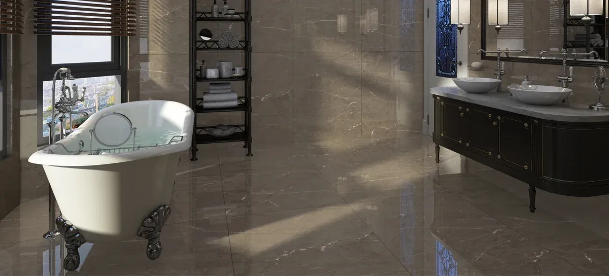 Porcelanato Armani Taupe Polido 90x90. Inspiração em mármore com veios elegantes.