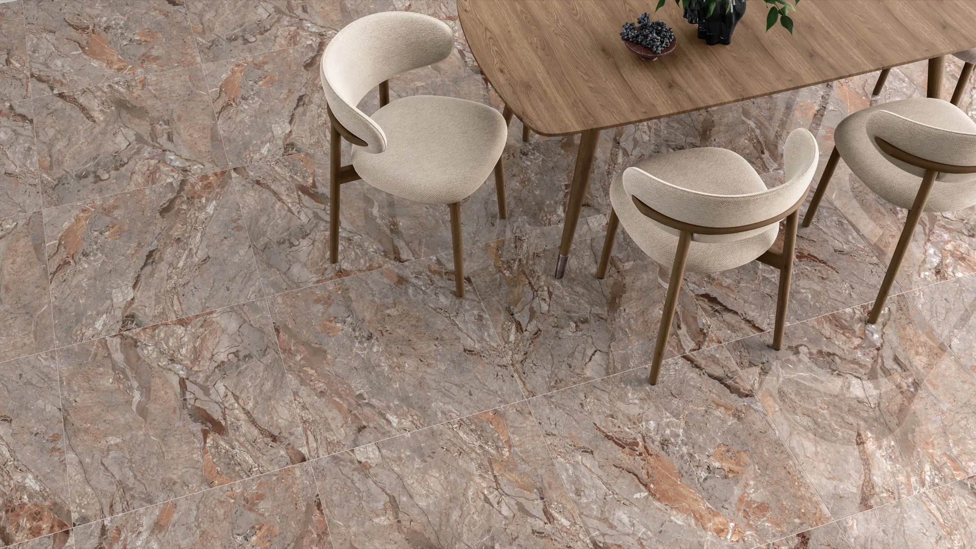 Porcelanato marmorizado Via Rosa. Acabamento polido, formato 71x71. Alta qualidade e sofisticação.