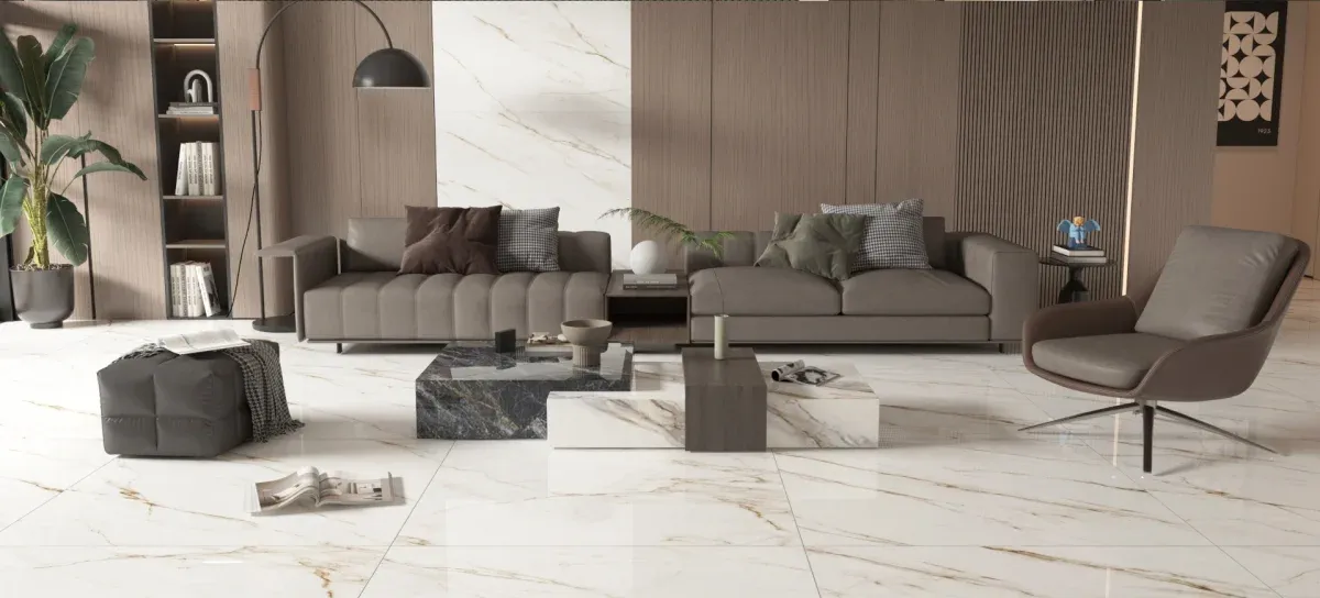 Porcelanato Raggi Oro Polido 120x120. Inspiração em mármore com veios elegantes.