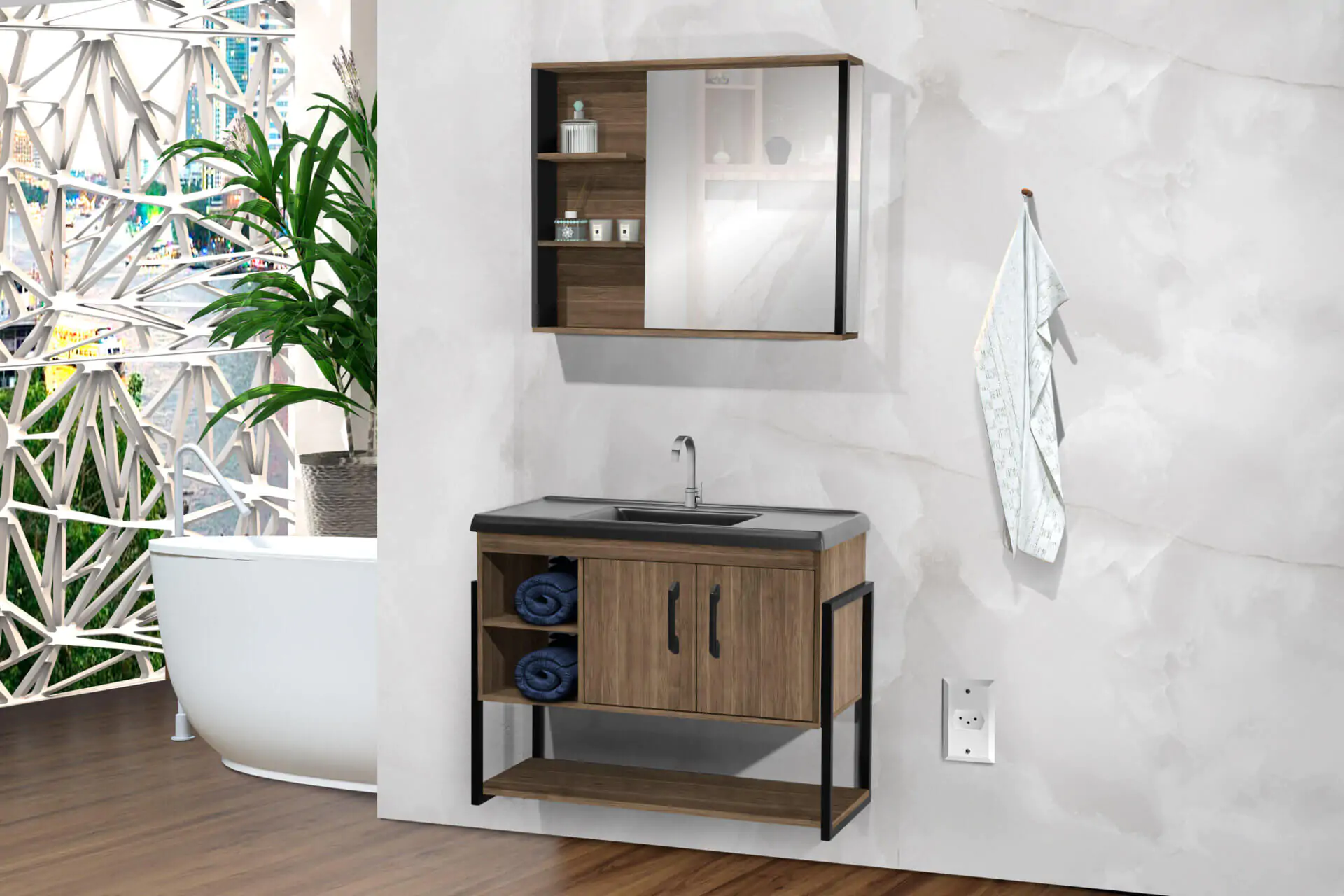 Kit com 80cm de largura em MDP/MDF, inclui espelheira, gabinete. Versão com pés metálicos para visual industrial. Disponível em 3 opções de cor.