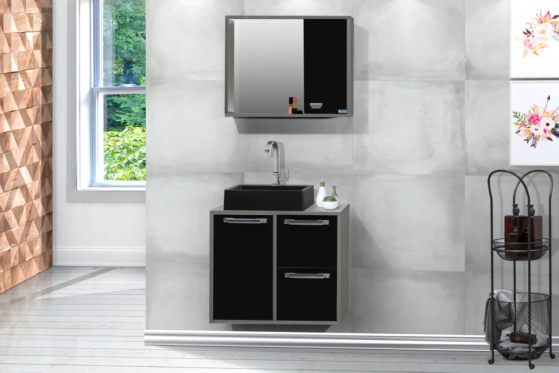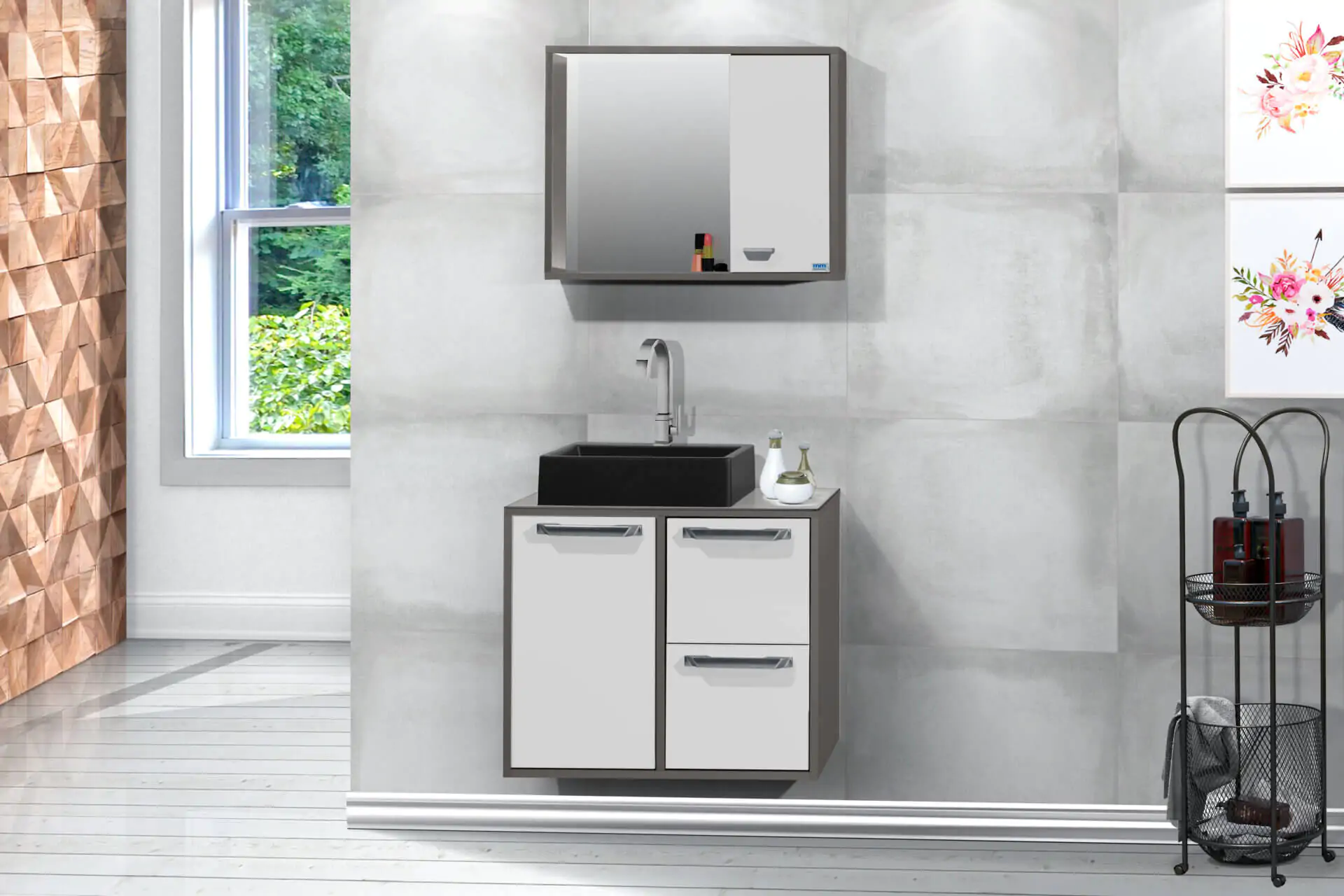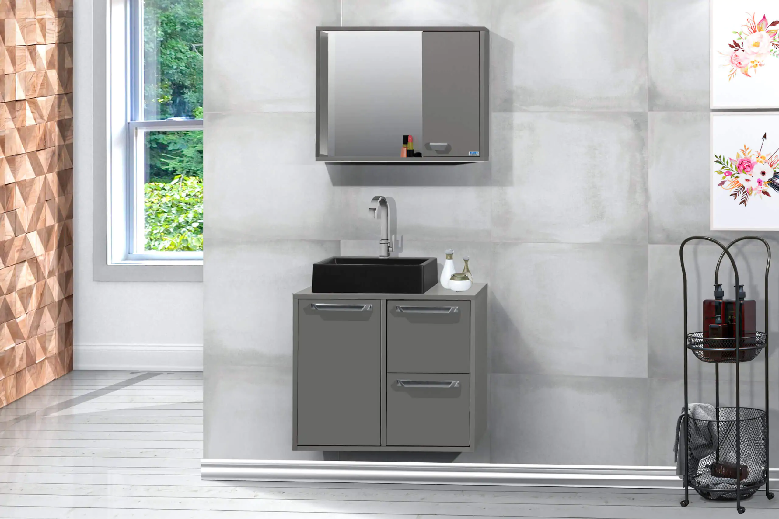 Kit com 60cm de largura em MDP/MDF, inclui cuba, espelheira, gabinete. Tampo de vidro opcional, gavetas com corrediças telescópicas. Disponível em 6 opções de cor.