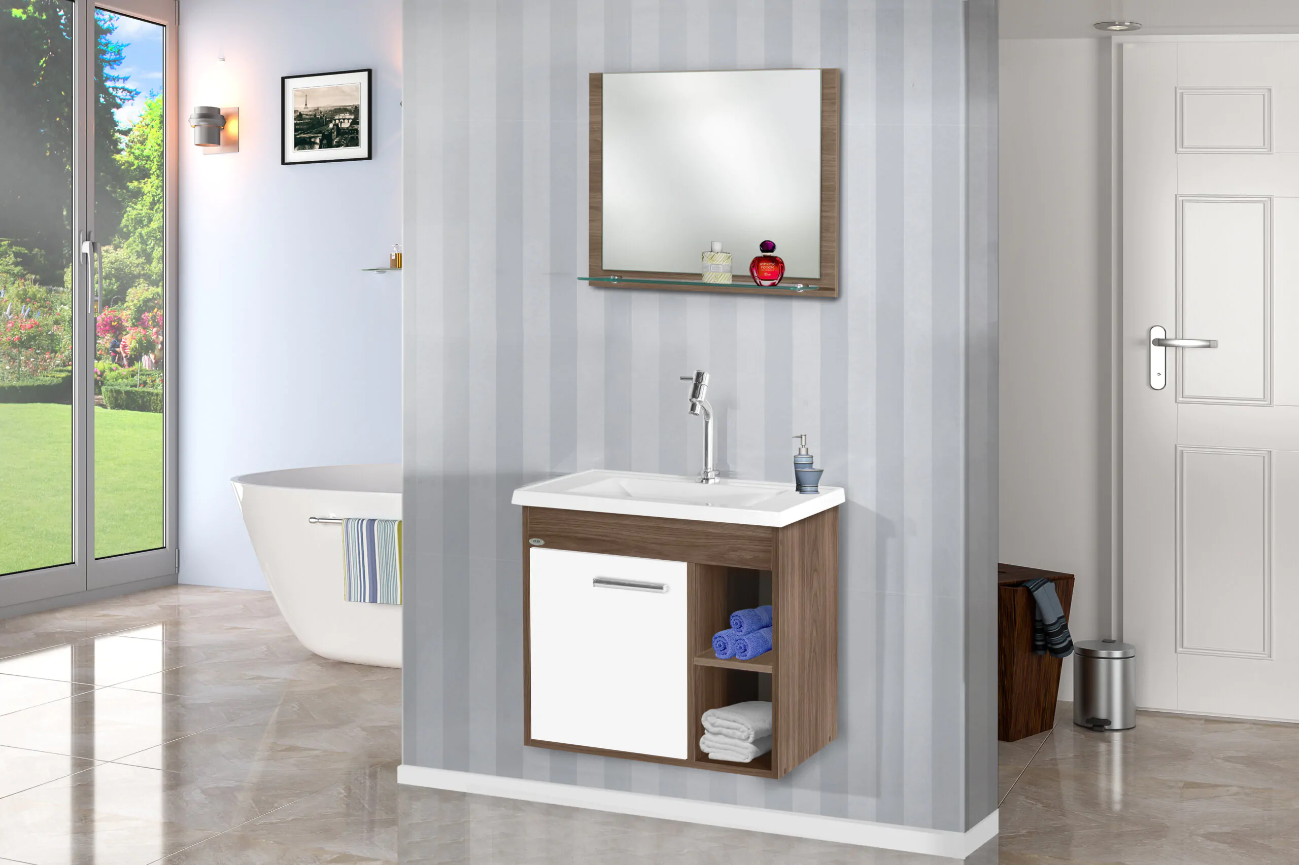 Kit com 60cm de largura em MDP/MDF, inclui espelheira, gabinete. Conjunto completo pronto para instalação. Disponível em 4 opções de cor.