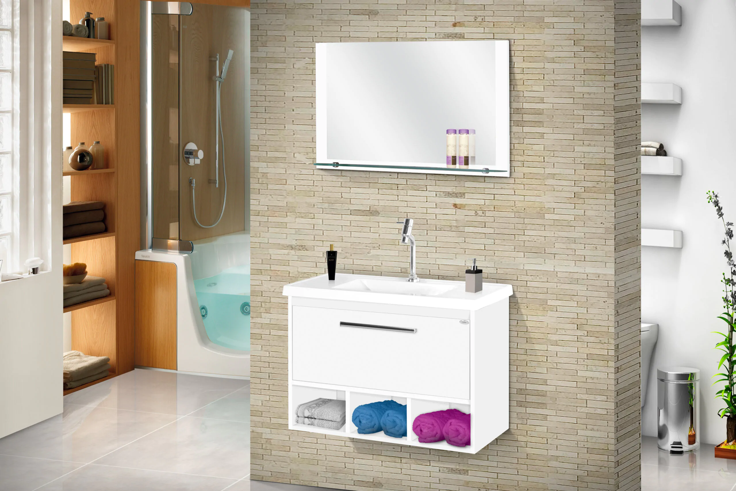 Kit com 70cm de largura em MDP/MDF, inclui espelheira, gabinete. Conjunto completo pronto para instalação. Disponível em 4 opções de cor.