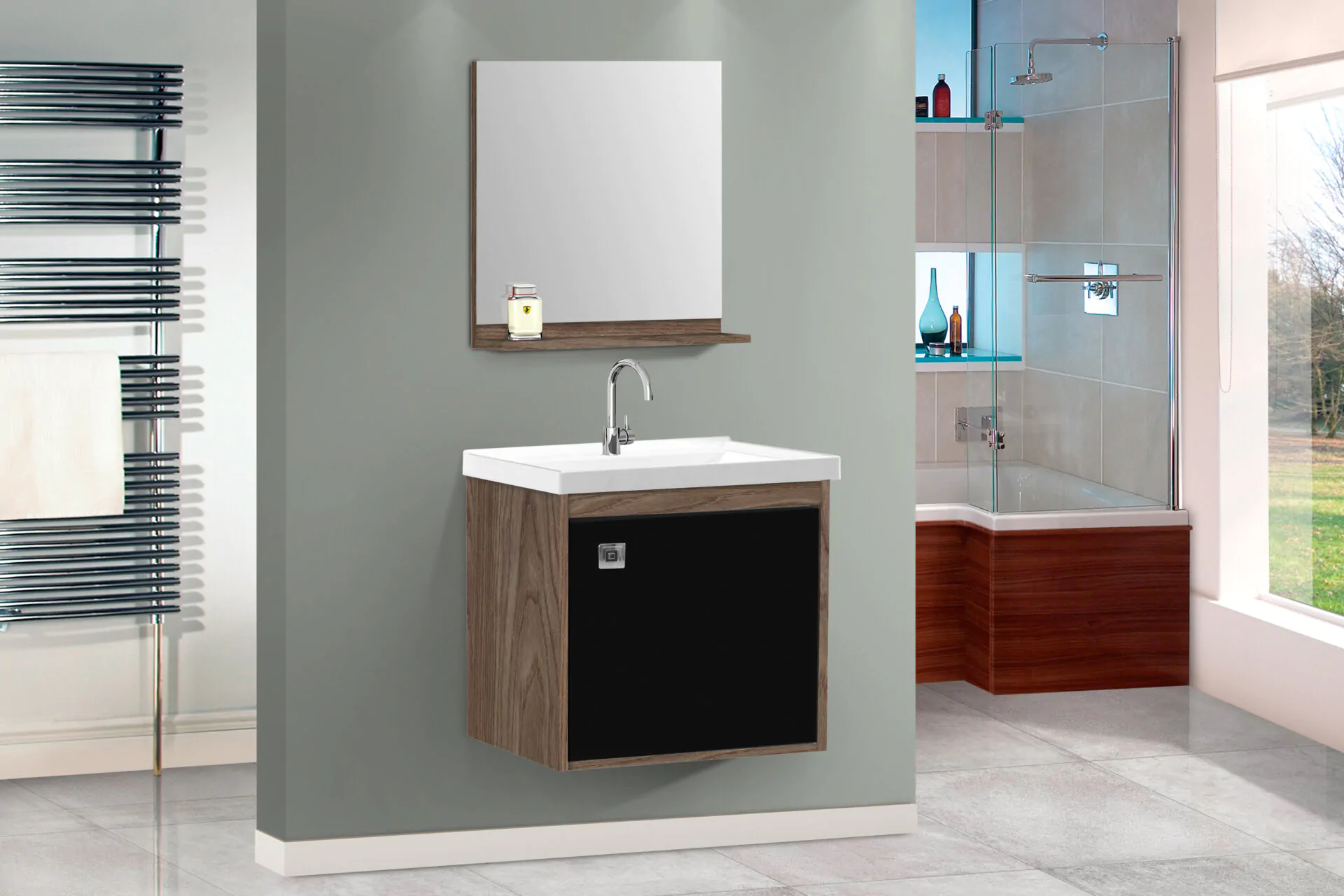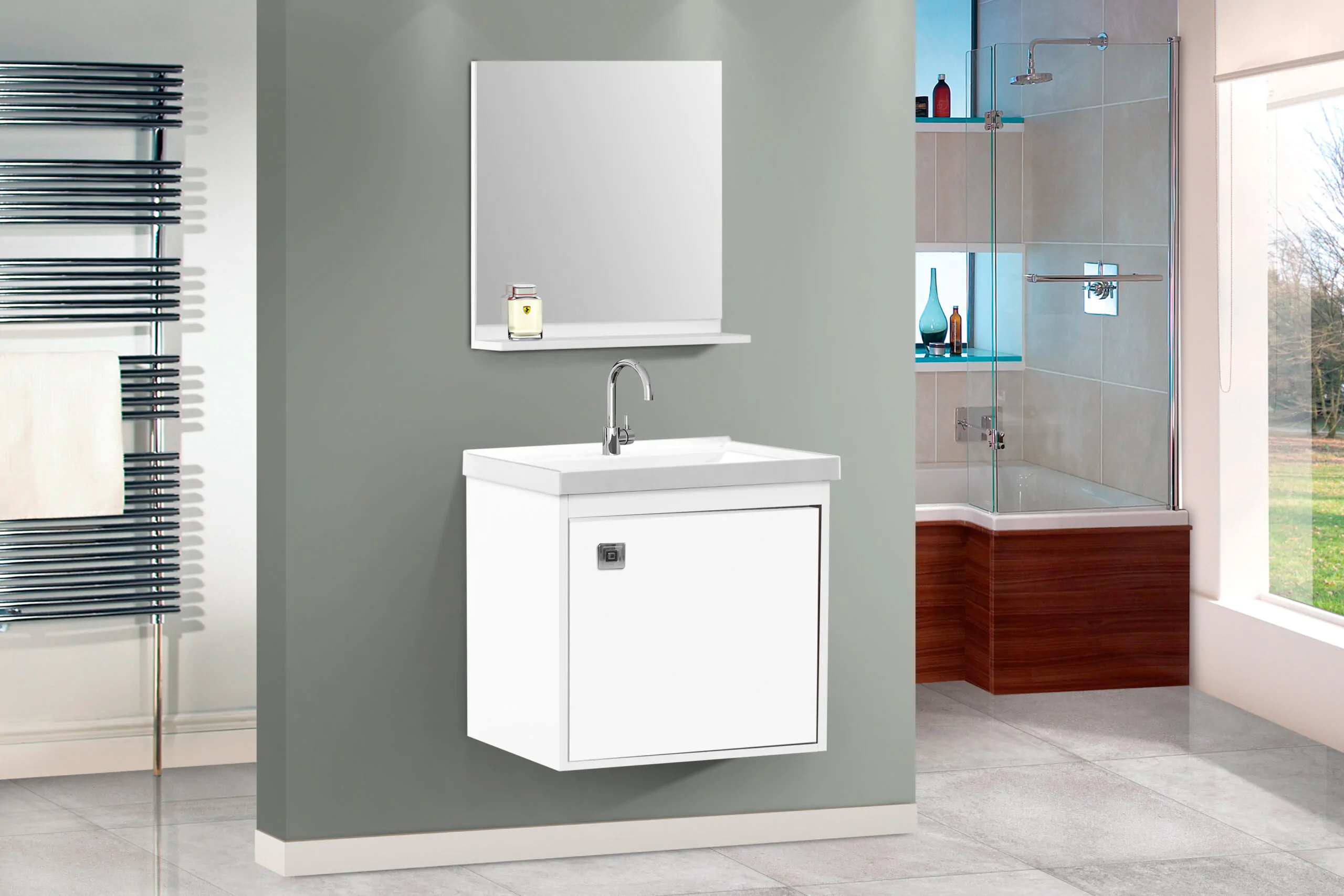 Kit com 40cm de largura em MDP/MDF, inclui cuba, espelheira, gabinete. Modelo compacto para banheiros e lavabos menores. Disponível em 5 opções de cor.