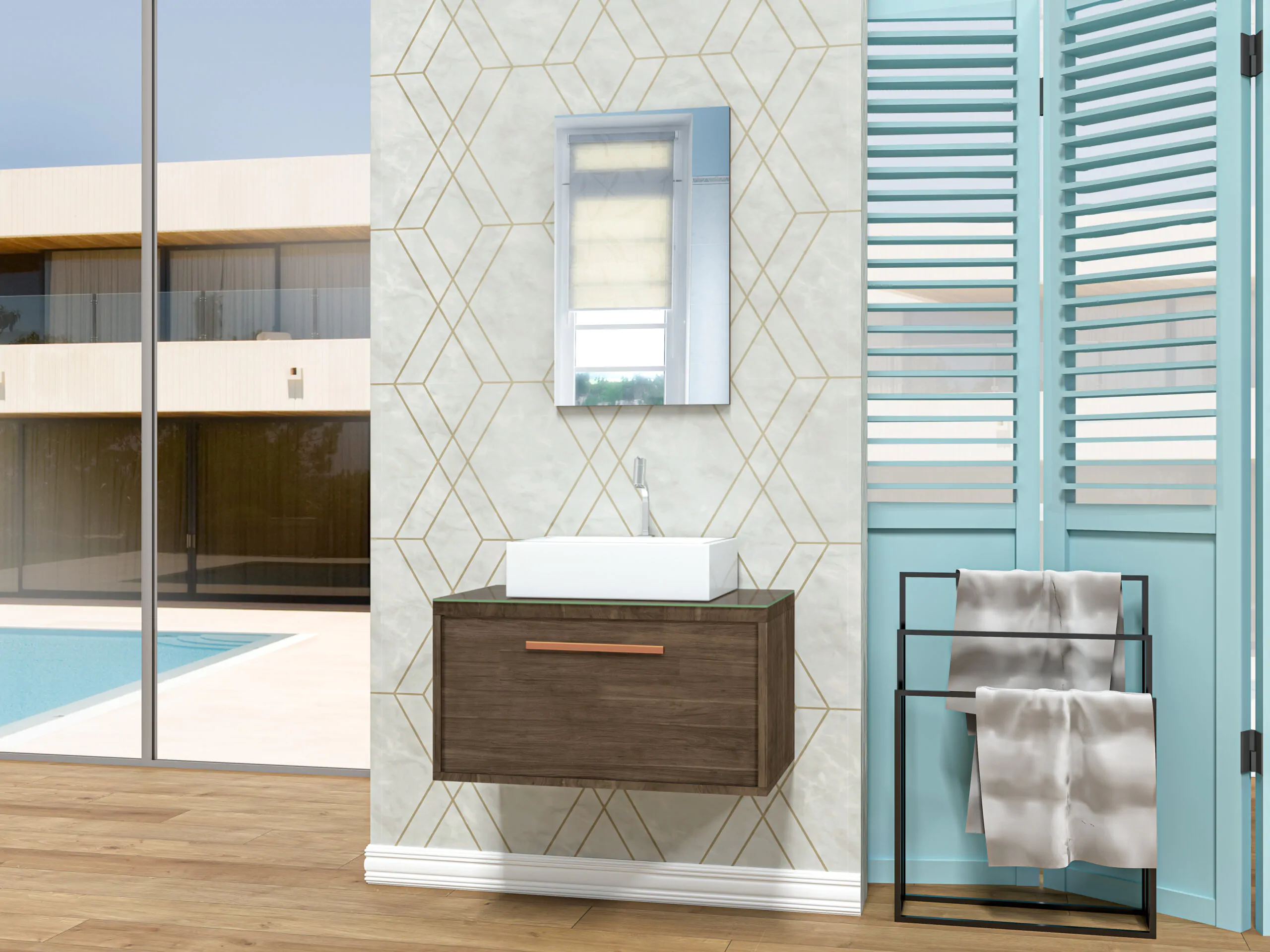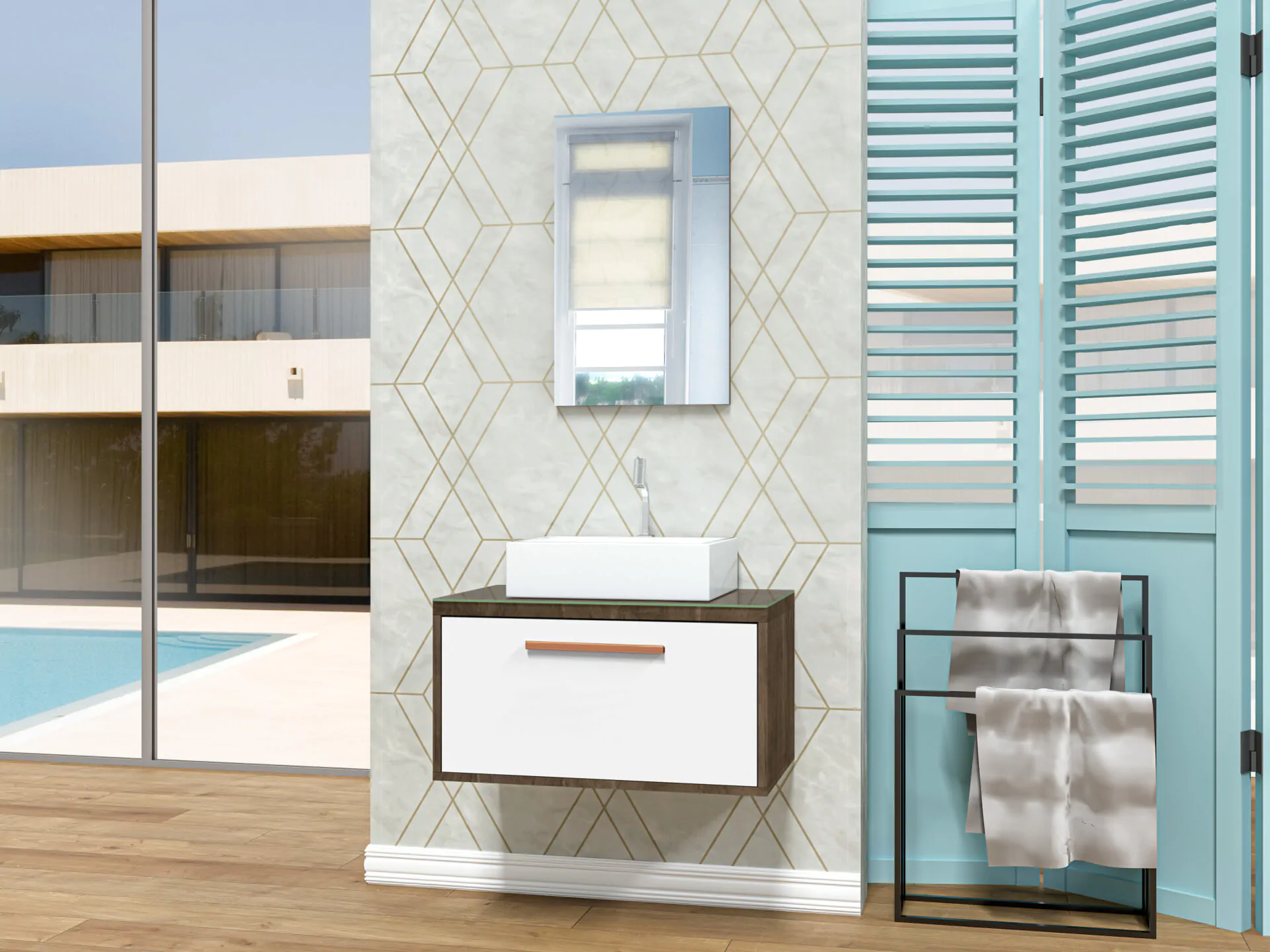 Kit com 60cm de largura em MDP/MDF, inclui cuba, espelheira, gabinete. Tampo de vidro opcional, porta com pistão a gás. Disponível em 2 opções de cor.