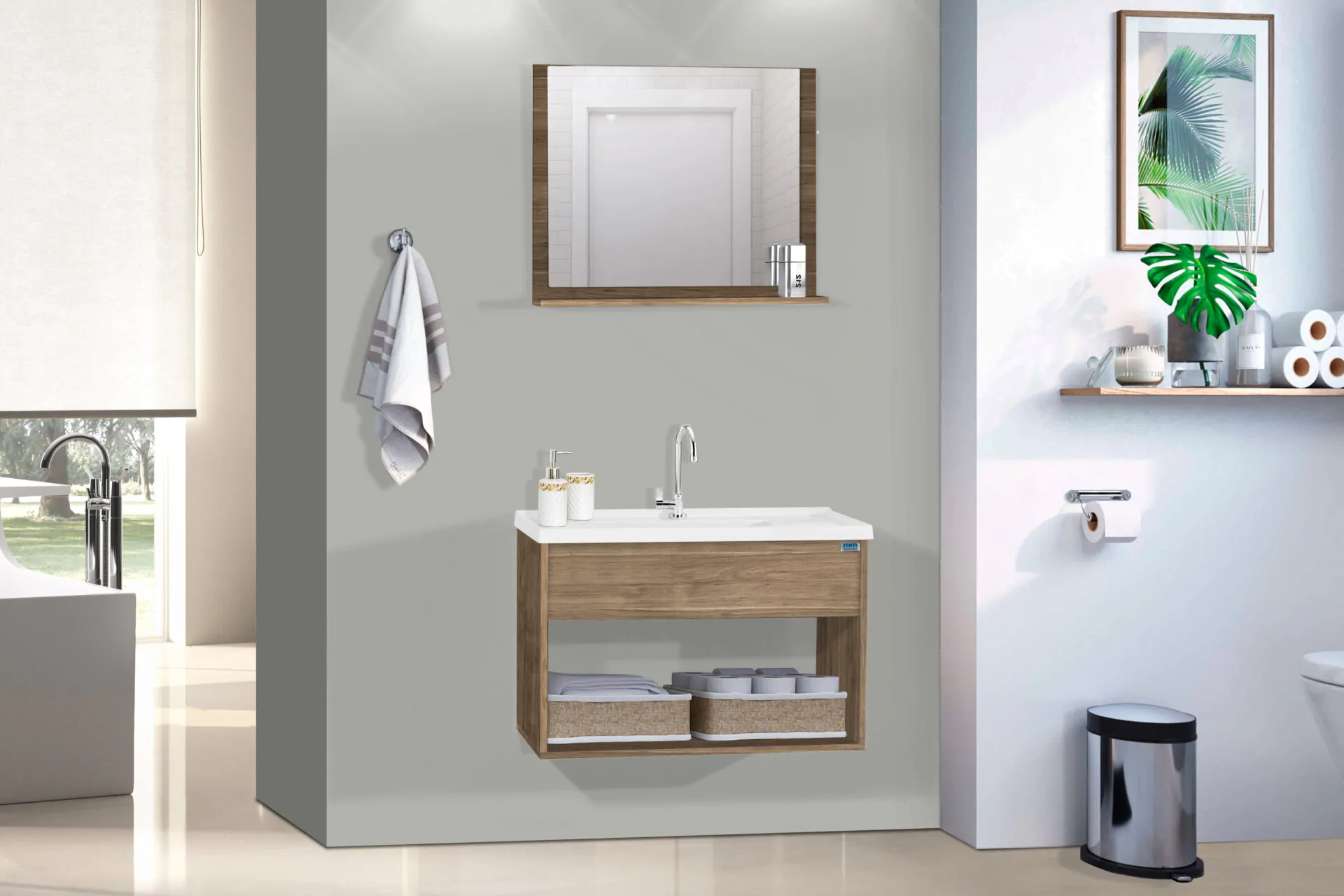 Kit com 60cm de largura em MDP/MDF, inclui espelheira, gabinete. Conjunto completo pronto para instalação. Disponível em 2 opções de cor.