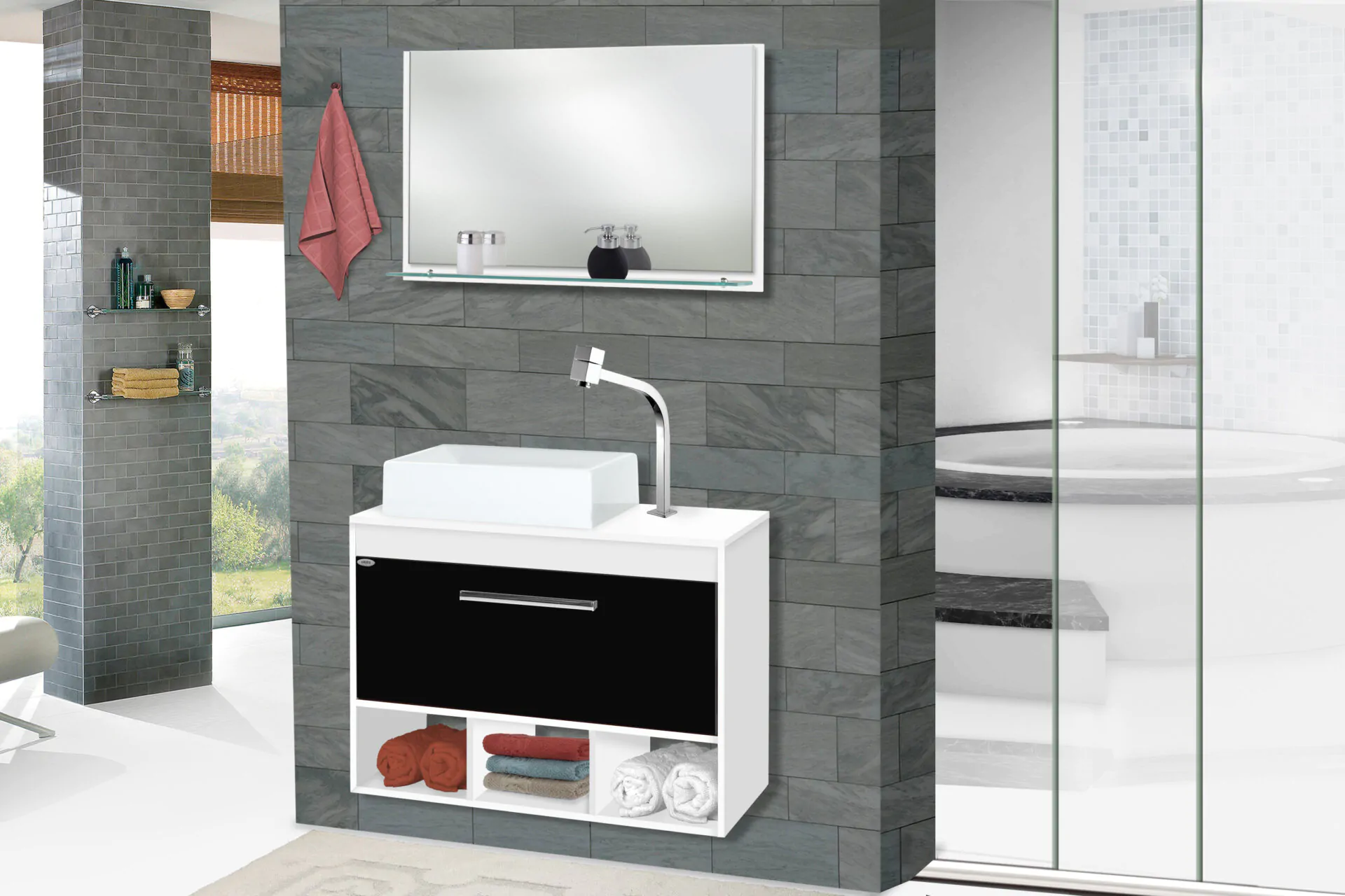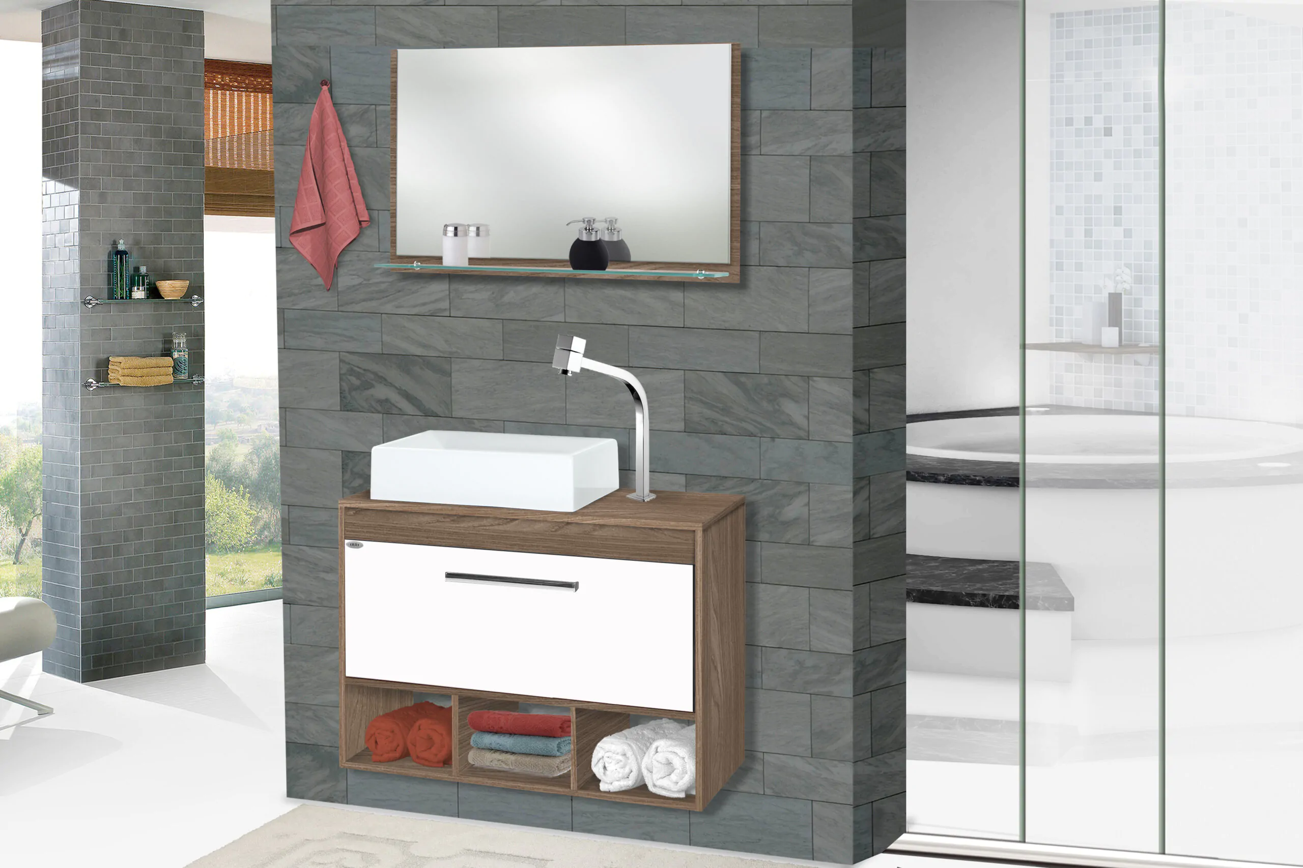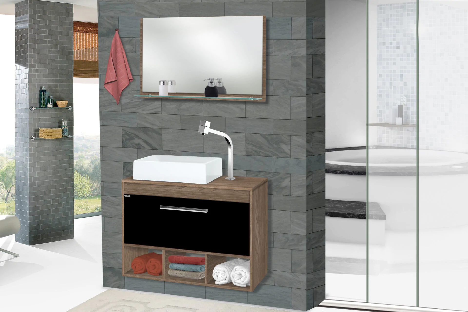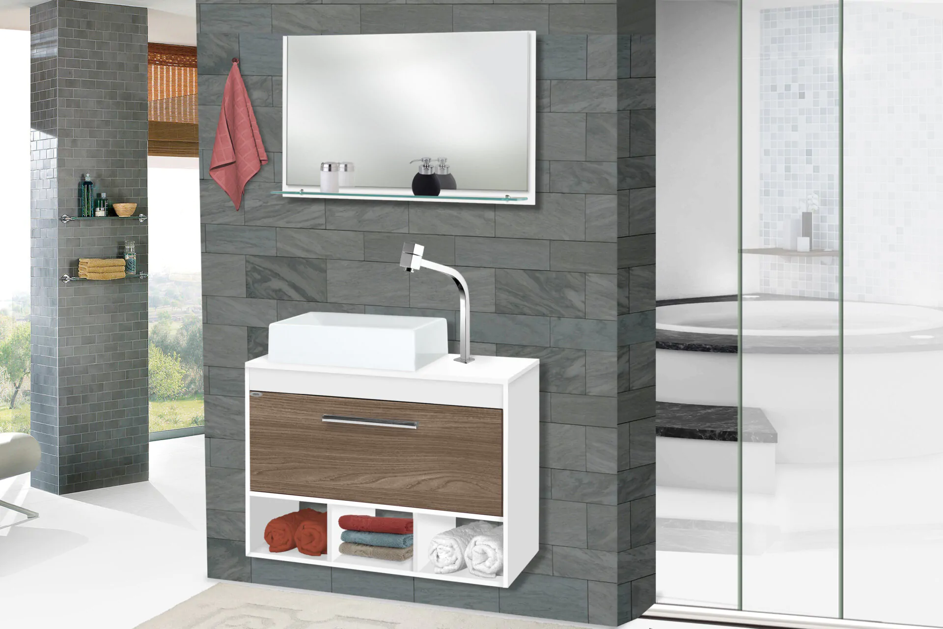 Kit com 70cm de largura em MDP/MDF, inclui cuba, espelheira, gabinete. Conjunto completo pronto para instalação. Disponível em 4 opções de cor.