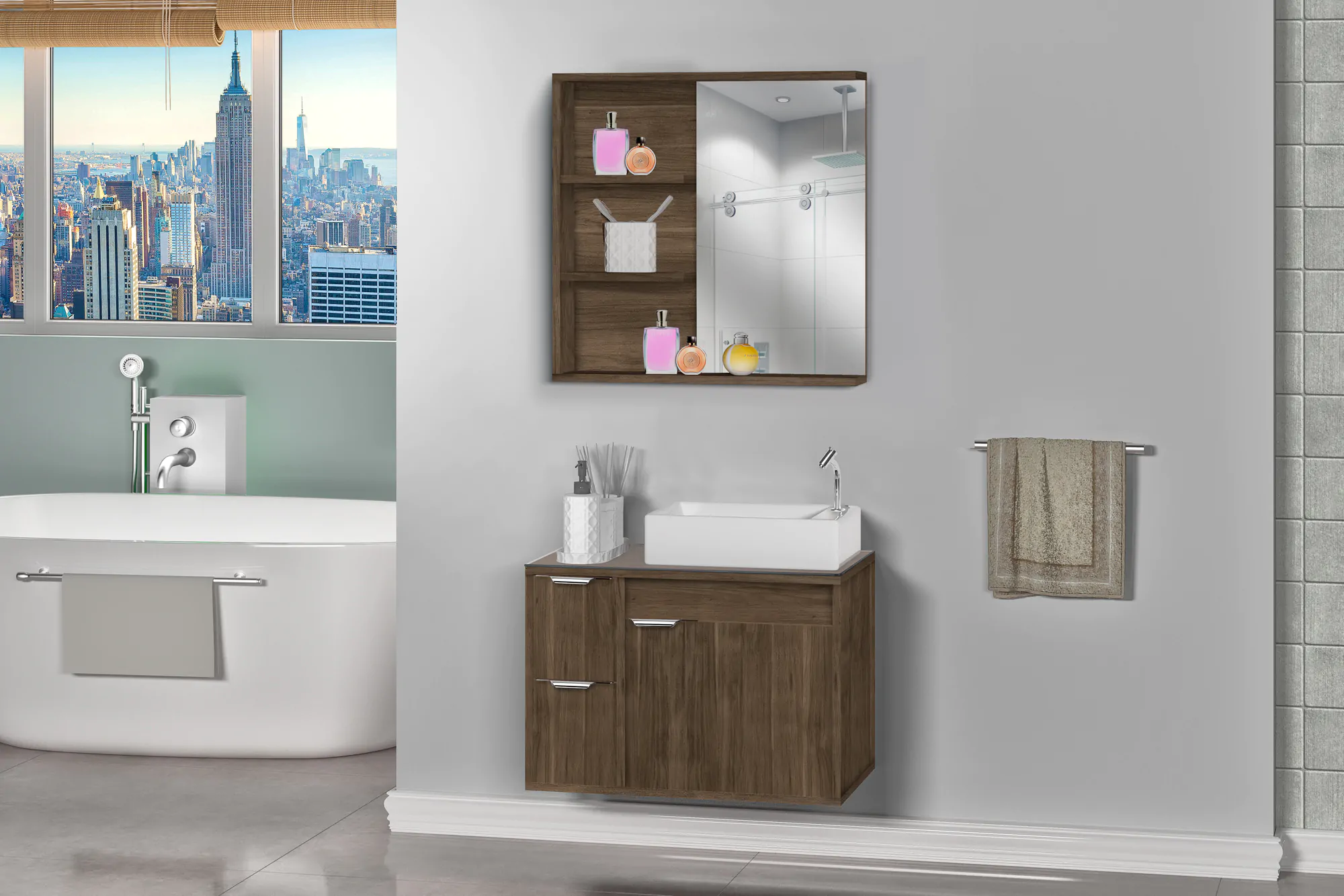 Kit com 60cm de largura em MDP/MDF, inclui cuba, espelheira, gabinete. Tampo de vidro opcional, gavetas com corrediças telescópicas. Disponível em 2 opções de cor.