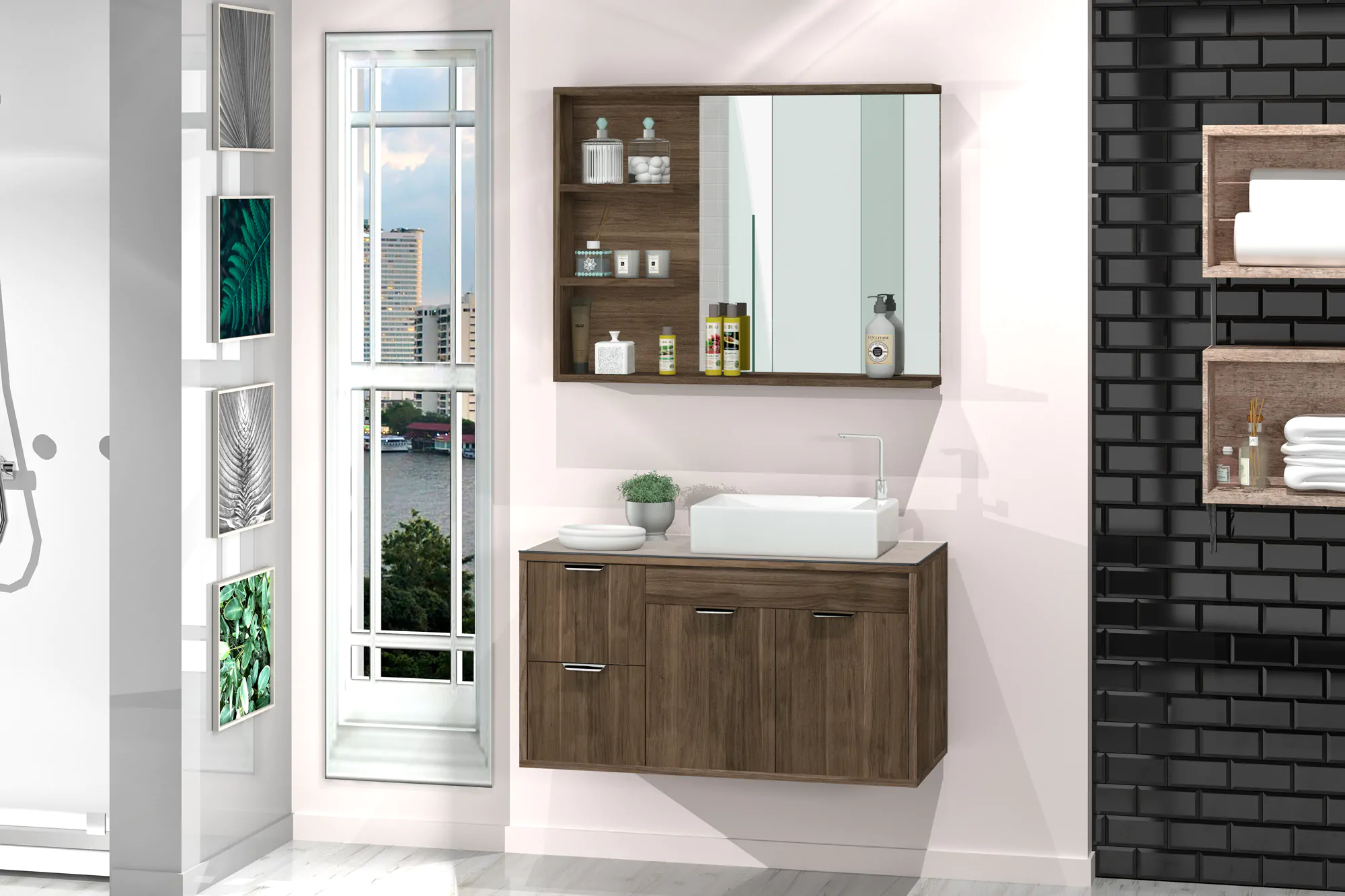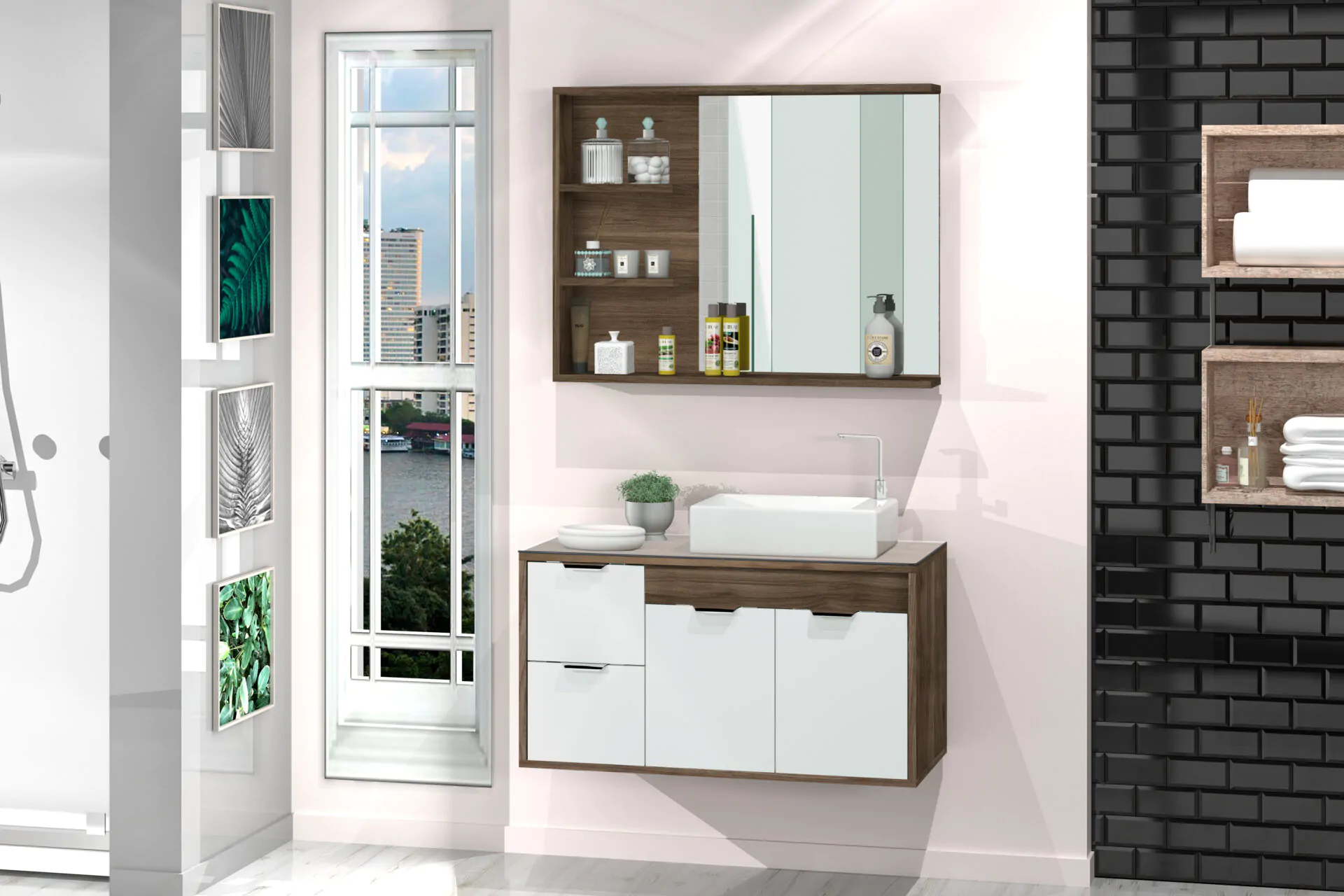 Kit com 80cm de largura em MDP/MDF, inclui cuba, espelheira, gabinete. Tampo de vidro opcional, gavetas com corrediças telescópicas. Disponível em 2 opções de cor.