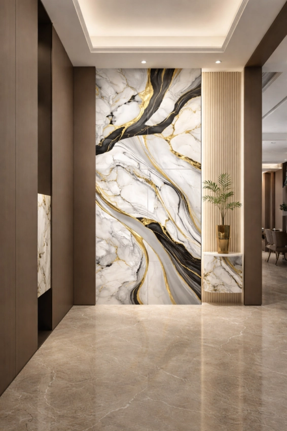 Mármore com veios dourados sobre fundo claro. Sofisticação e brilho.