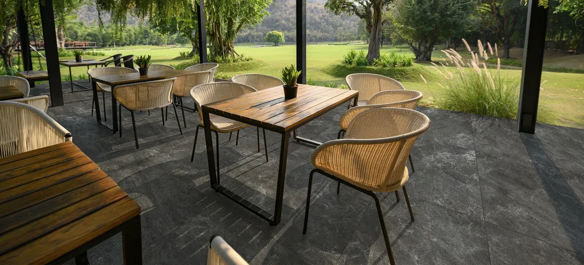 Porcelanato Luserna Carbon Granilhado 90x90. Reproduz a beleza natural da pedra.