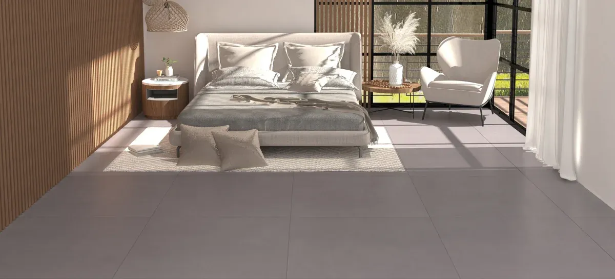 Porcelanato Obelisco Grigio Acetinado 90x90. Visual urbano e contemporâneo com efeito cimentício.