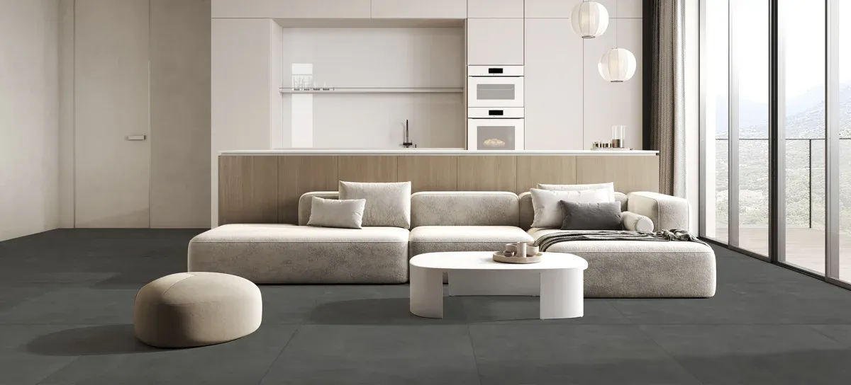 Porcelanato Piazza Beton Acetinado 90x90. Visual urbano e contemporâneo com efeito cimentício.